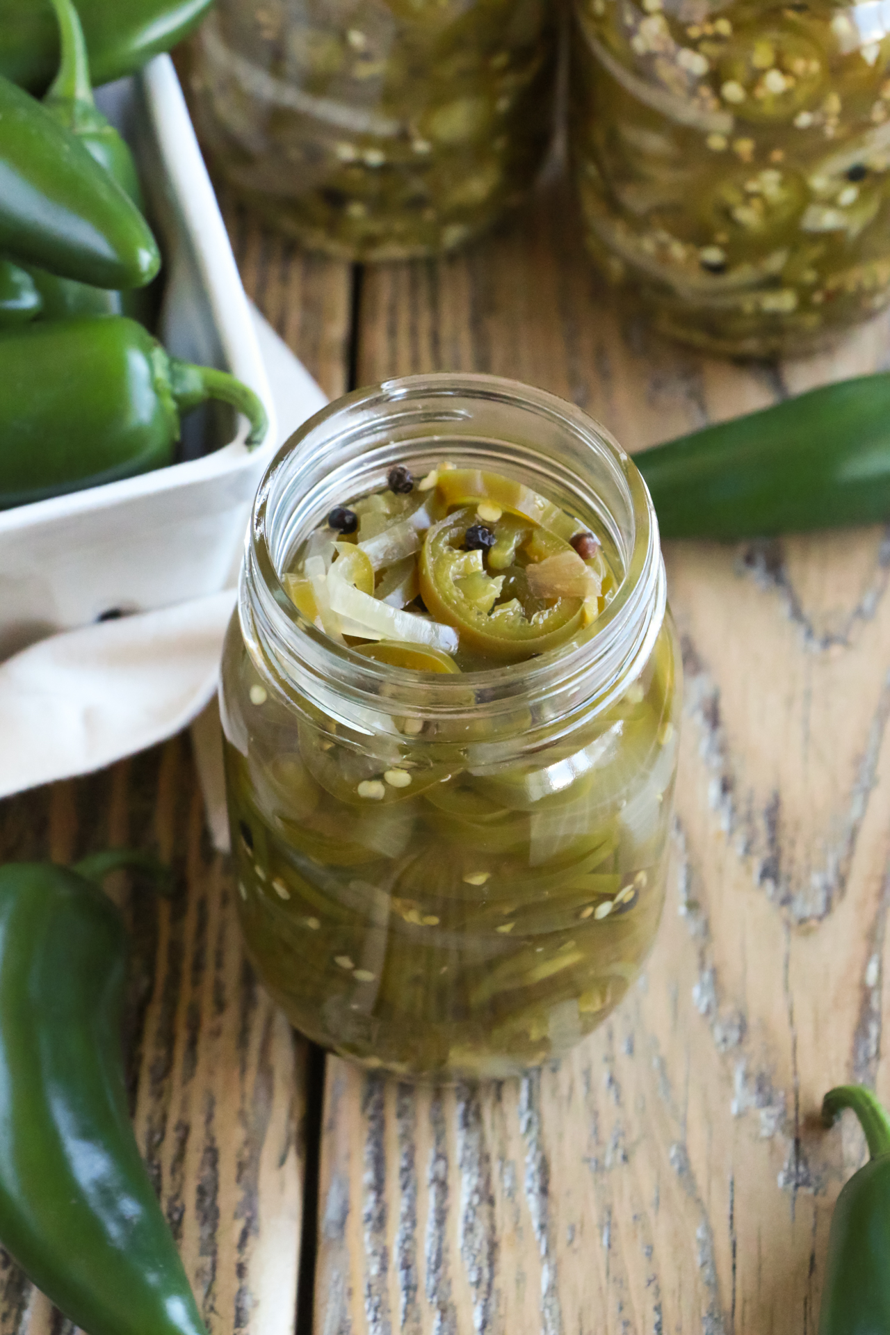 Using tongs, ladle hot jalapenos and onions into hot jars, leaving a ½ inch headspace. Top off with more brine as necessary. Try to distribute the spices as evenly as possible among the jars.