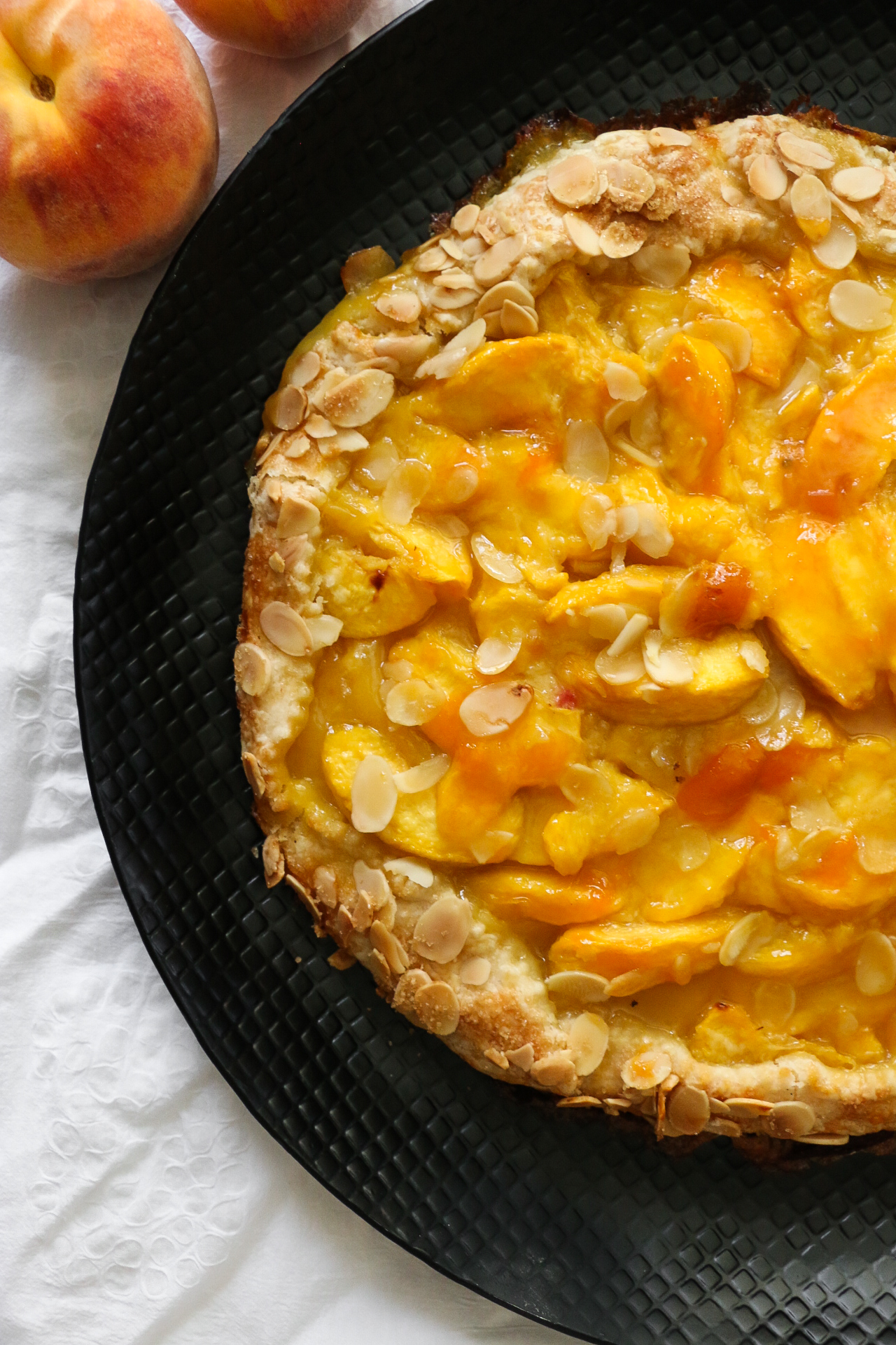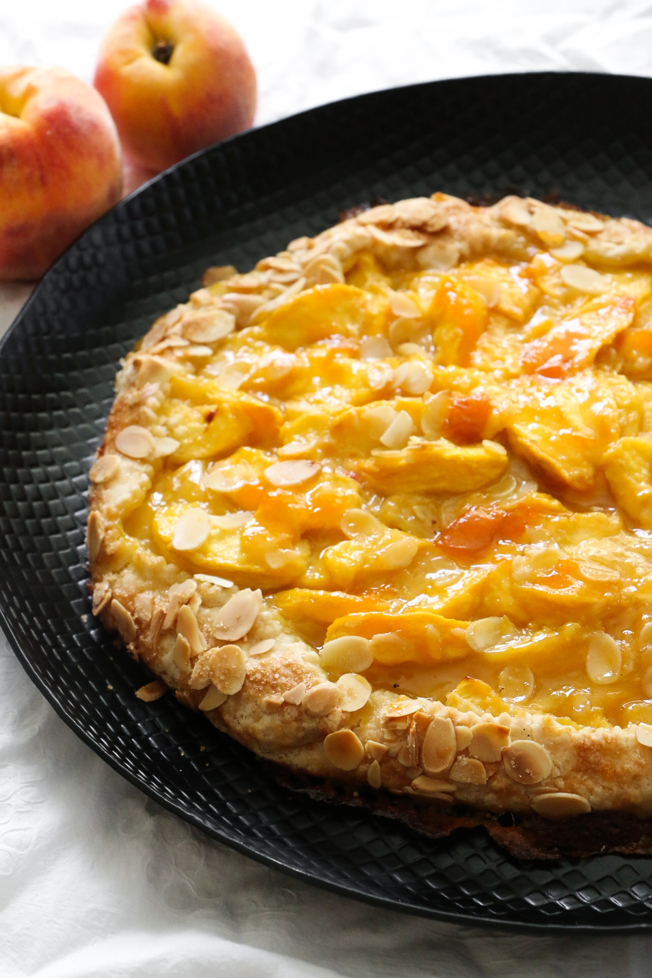 Once the juices are bubbling in the center, brush the fruit with warmed apricot or peach jam. Return to the oven for a few more minutes ,just until the top is glossy.