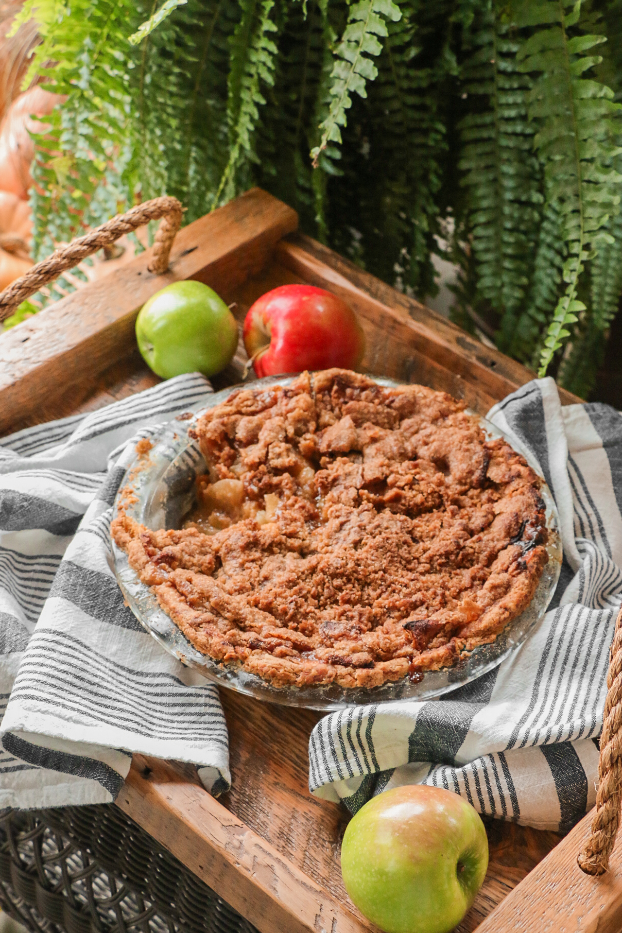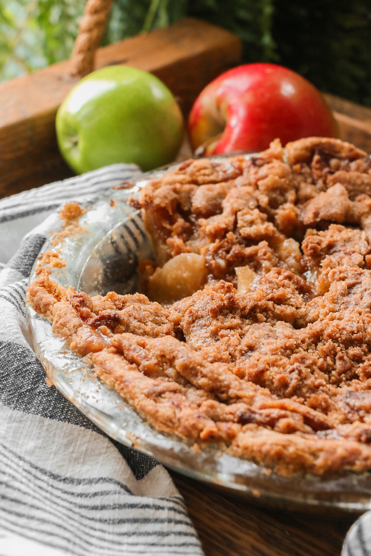 Place the pie on a baking sheet to catch any drips, bake at 425°F for 15 minutes, then reduce heat to 350°F and bake for an additional 30-45 minutes until the crumb and crust are golden. Start checking for doneness after 30 minutes. As oven temperatures vary, it may take up to an extra hour to bake. If the crust and/or crumb begins to brown too quickly, cover the pie loosely with foil and/or a pie shield. Make sure to bake the pie long enough that the mixture is bubbly to ensure that the bottom crust is cooked. Since you are baking the apples raw, they will release juice which can make the bottom crust slightly soggy. Positioning the rack to the lowest position and baking the pie long enough will ensure that the bottom crust bakes properly.