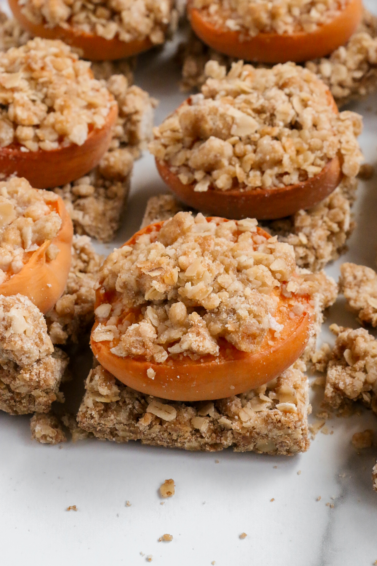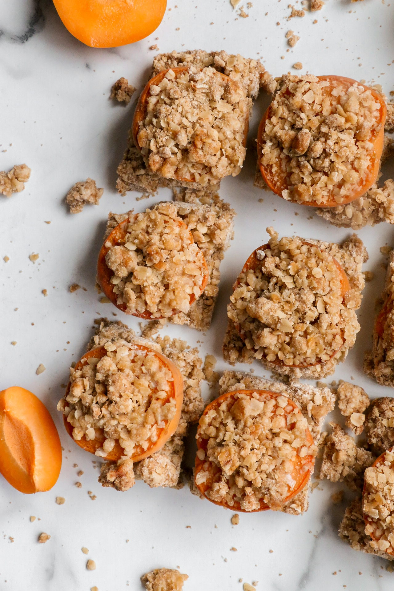 Place halved (or cubed) apricots onto the base. Finally, crumble remaining dough evenly over top. Drizzle with honey to finish.