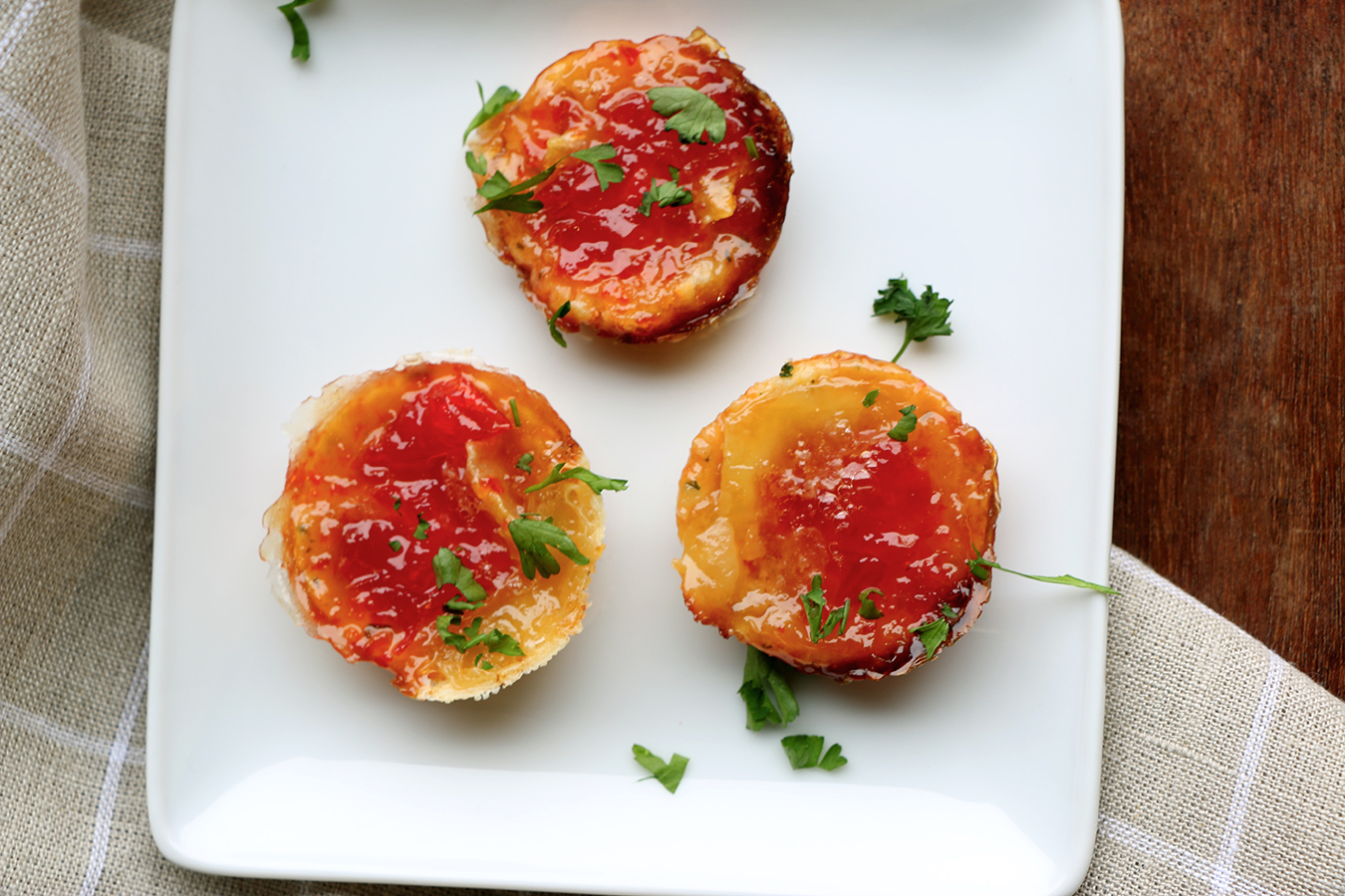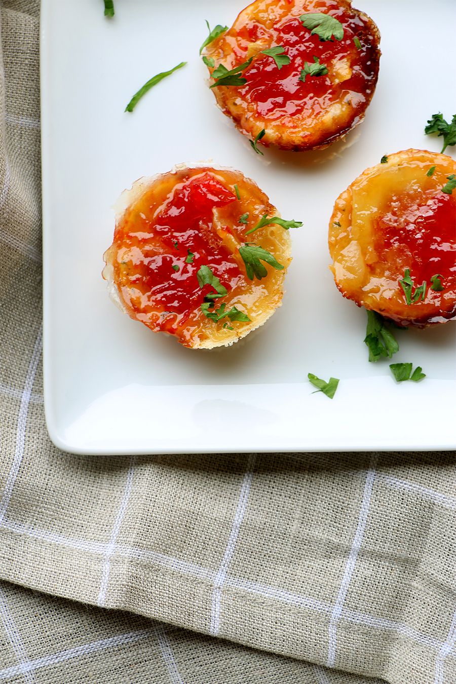 Bake for 15 minutes. Take tarts out of the oven and top with red pepper jelly.
