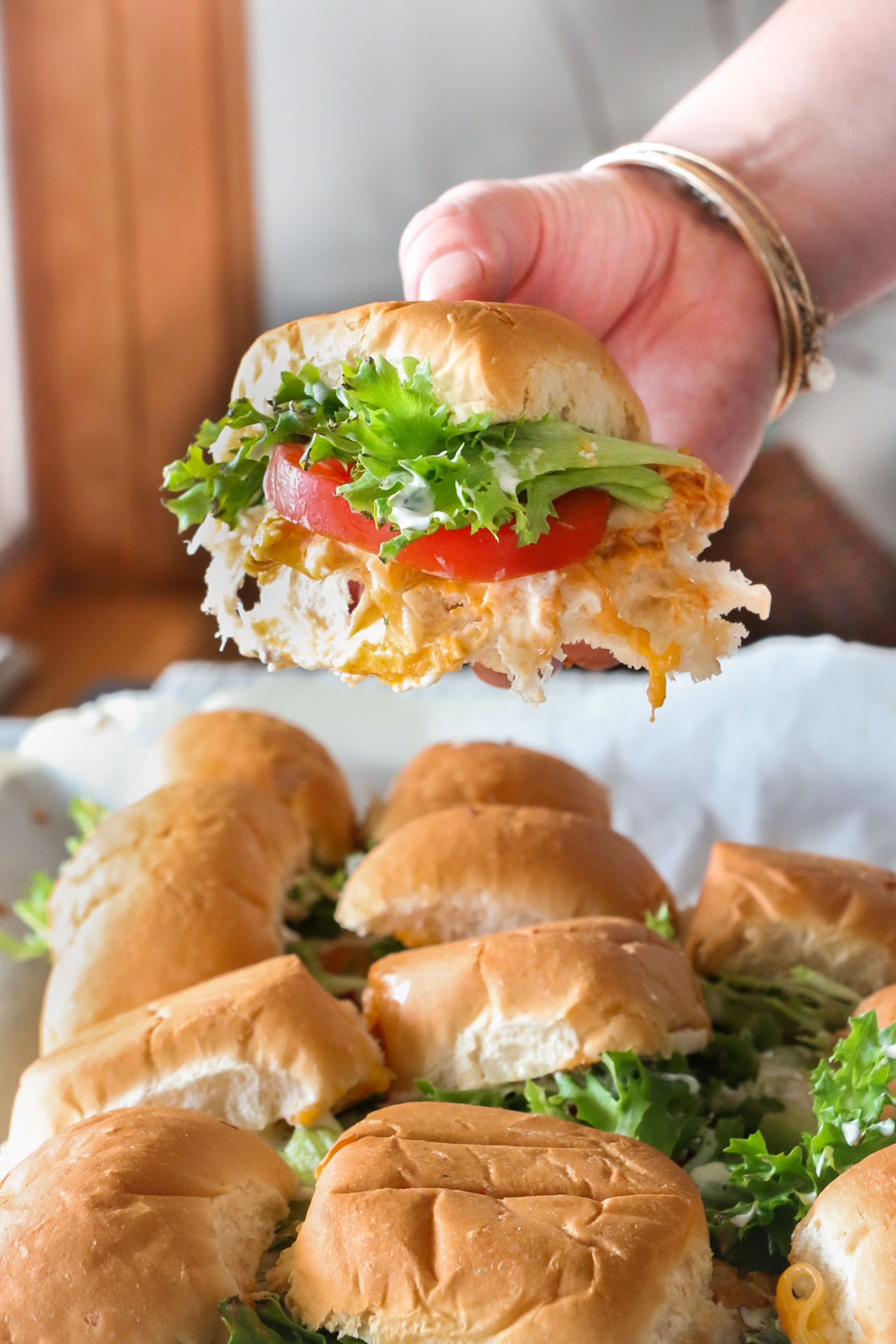 To serve, add fresh slices of tomato and Lepp’s leafy green lettuce to each slider. Drizzle with more of Lepp’s ranch dressing before placing the tops of the sliders back on top. Enjoy!
