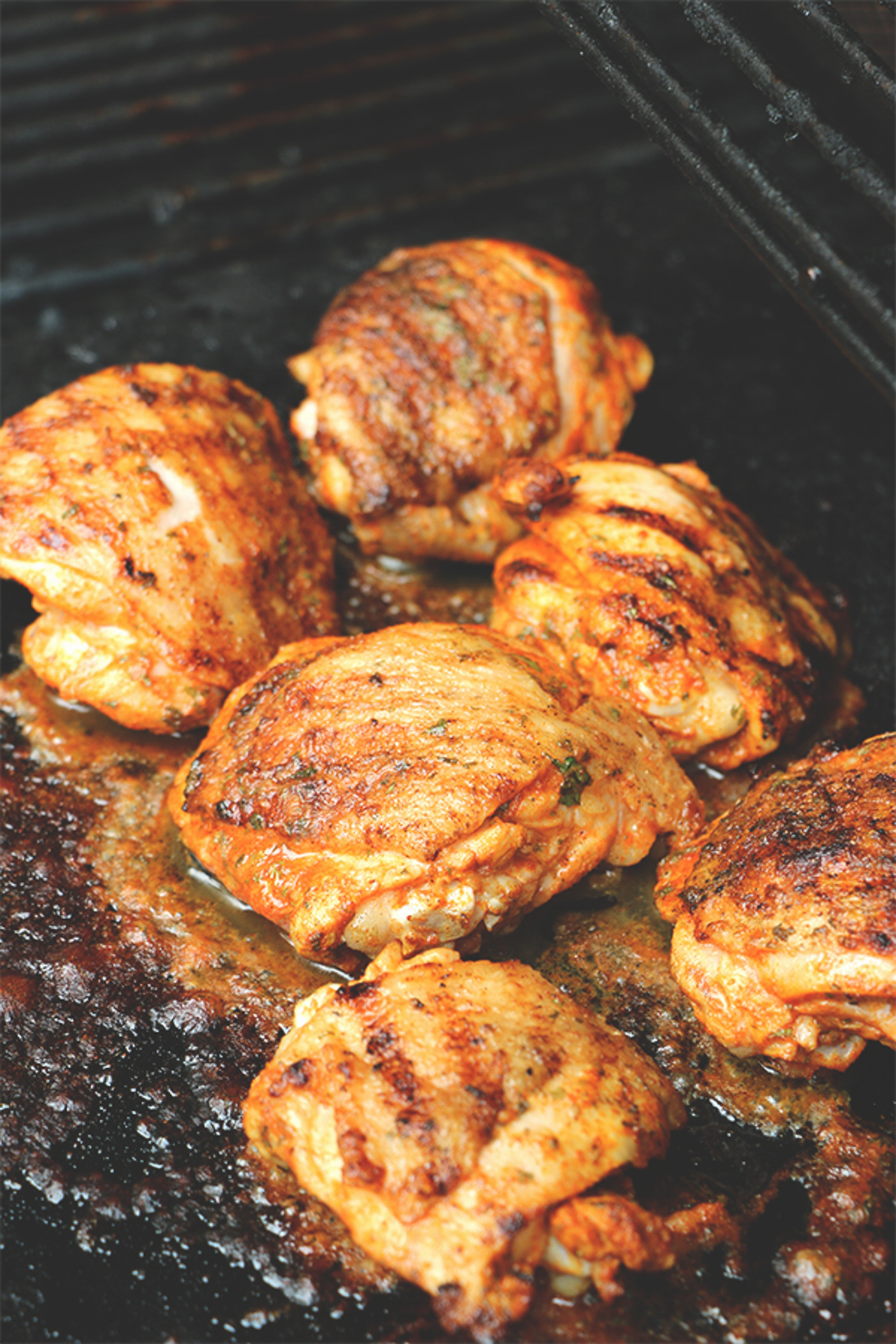 If you’re feeding a bigger family, or especially hungry people, you may want to the entire chicken leg in this recipe instead of just the thigh. But for perfectly grilled drumsticks or thighs that aren’t burnt on the outside and raw on the inside, the best method is a two-step, two-temperature approach. First, cut the legs into 2 pieces, separating the drumsticks and thighs and trim away any loose, fatty skin. If you’re using a gas grill, turn half (or even just one) of your burners on high and leave the other ones off. Place your chicken leg pieces directly over the heat for a few minutes on each side, searing them beautifully. Then move them to the indirect heat, close the lid and cook them low and slow until they’re done, reaching an internal temperature of 175 degrees. You could also cover and bake them at 350 degrees for 45 minutes.