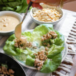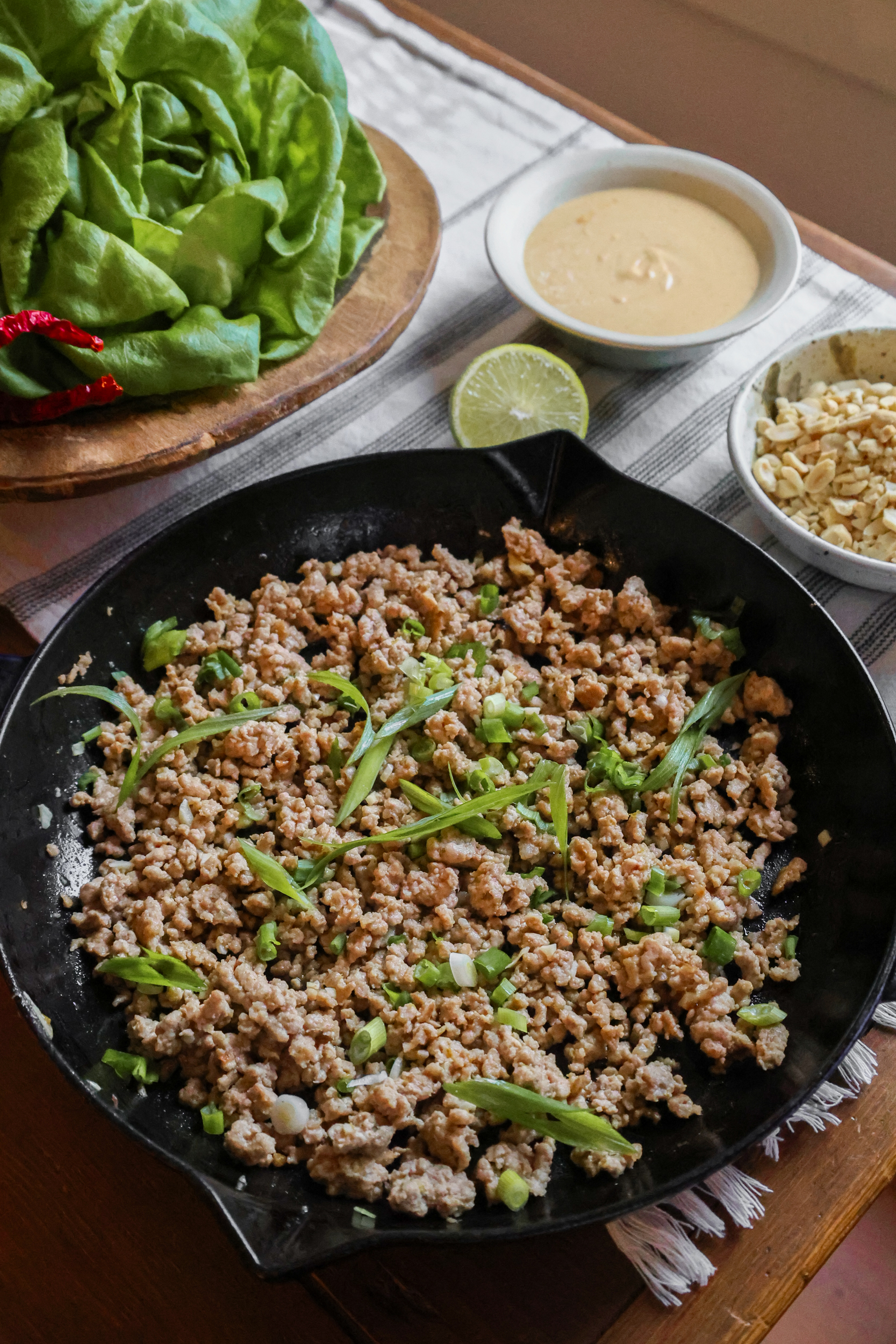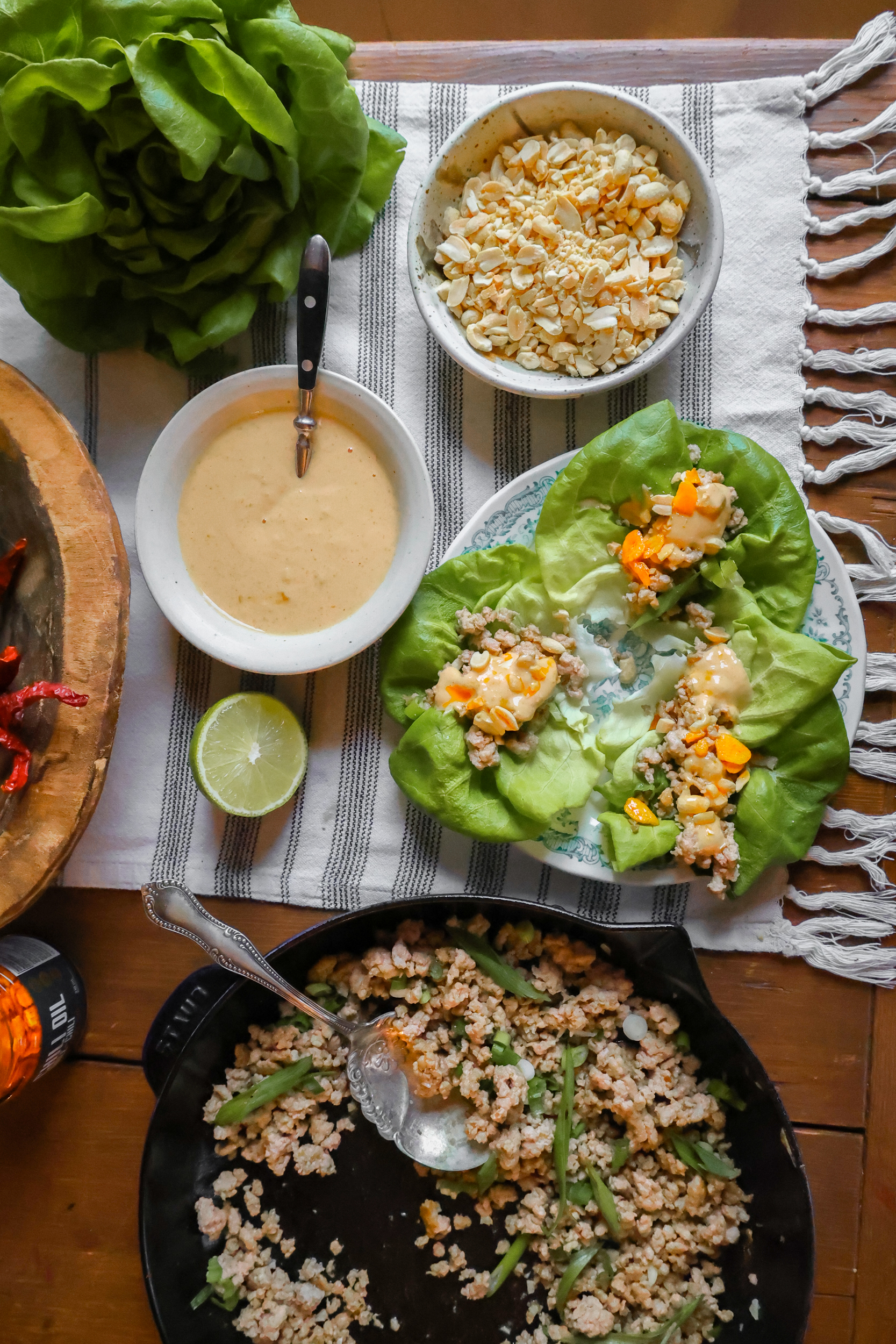 When everything is prepared, place a scoop of the pork in a leaf of butter lettuce and add a drizzle of peanut sauce. Dress it up with fresh cilantro, green onion, or chili oil on top and enjoy!
