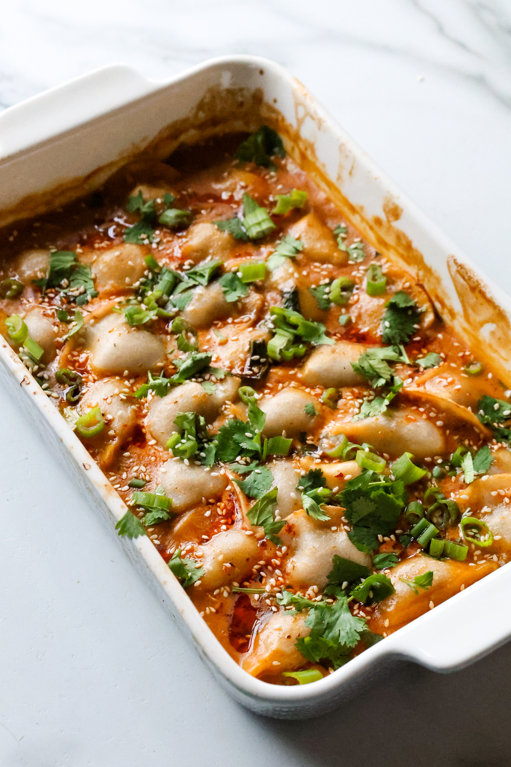 - Garnish and serve: Remove from the oven. Finish with chili oil, cilantro, green onions, and sesame seeds before serving.
