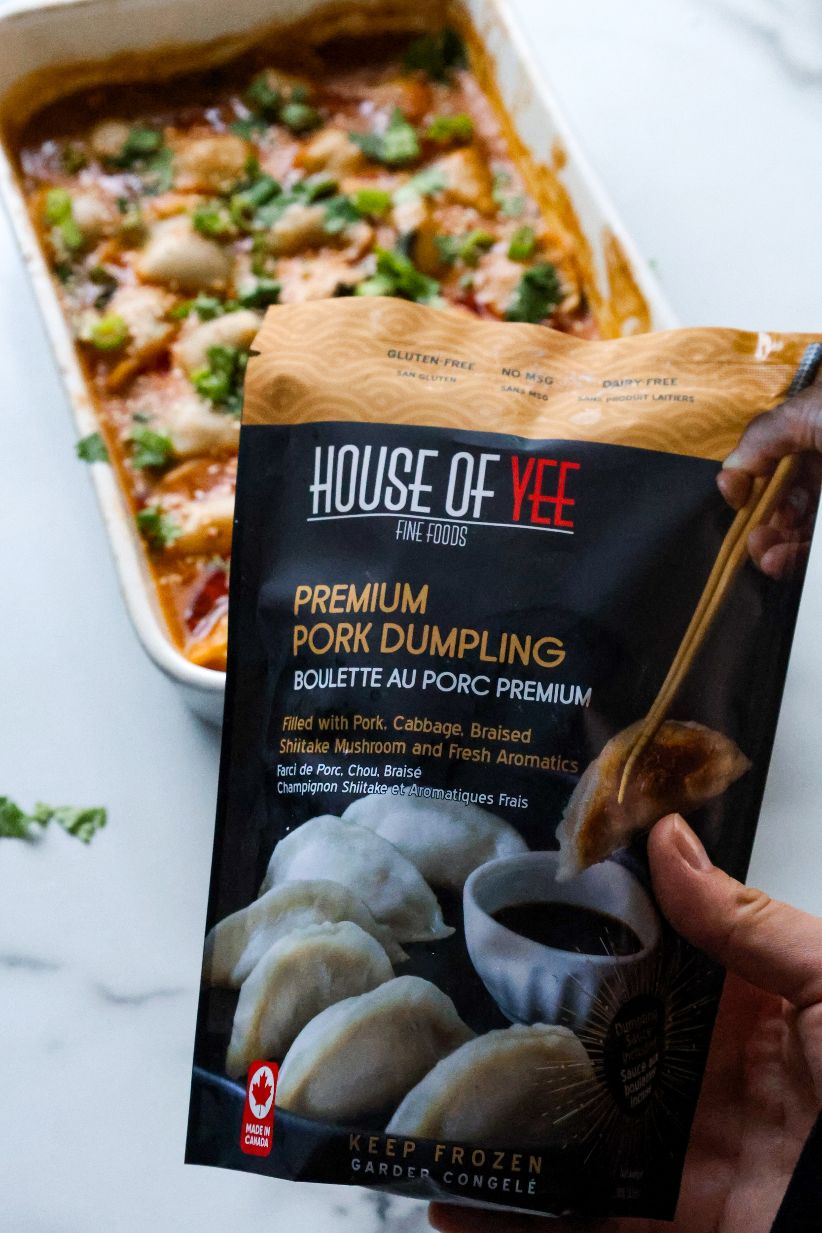This is a super easy one-pan dinner or appetizer! Try it with the House of Yee gluten-free chicken or pork dumplings.