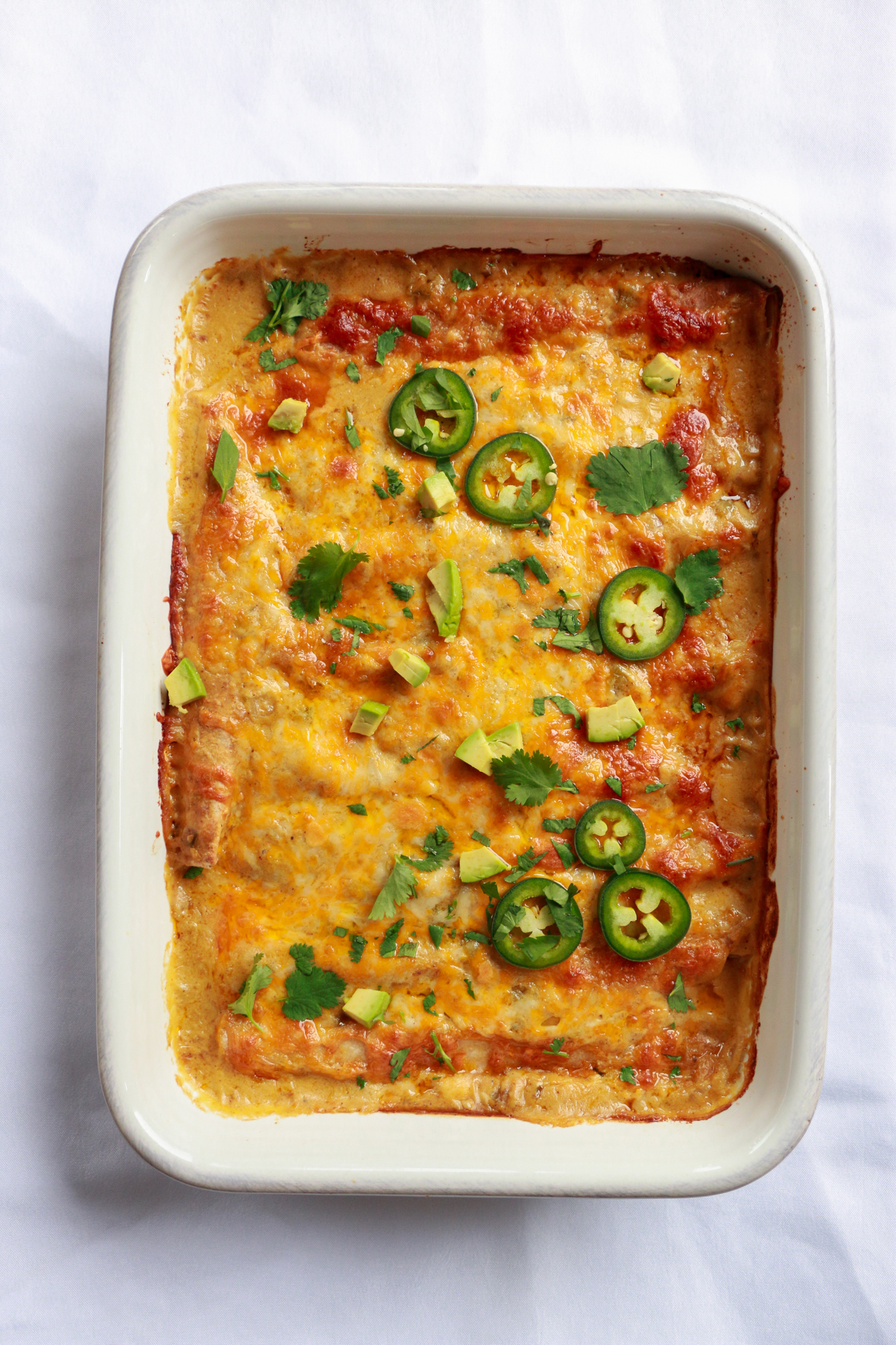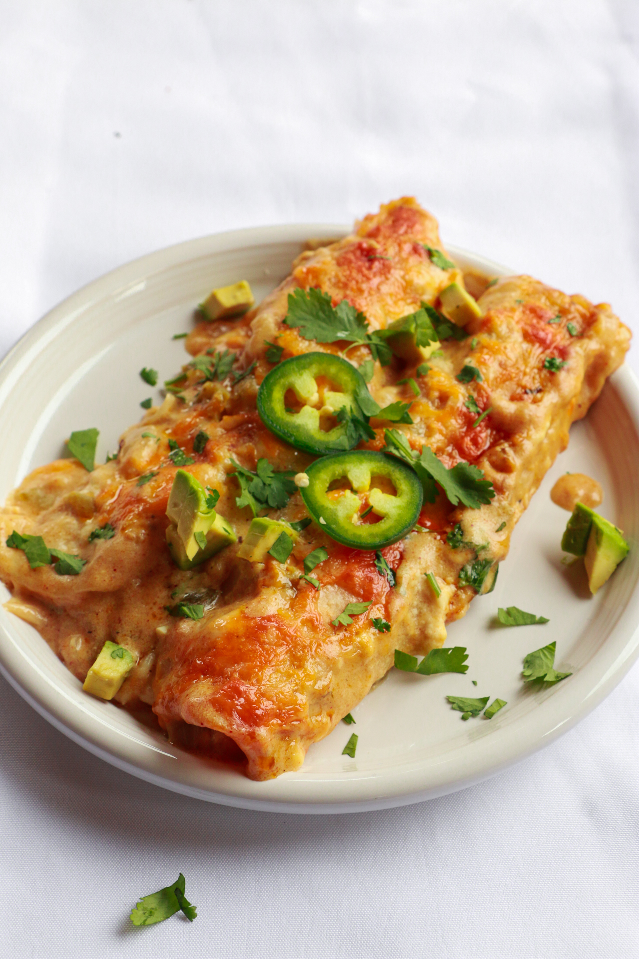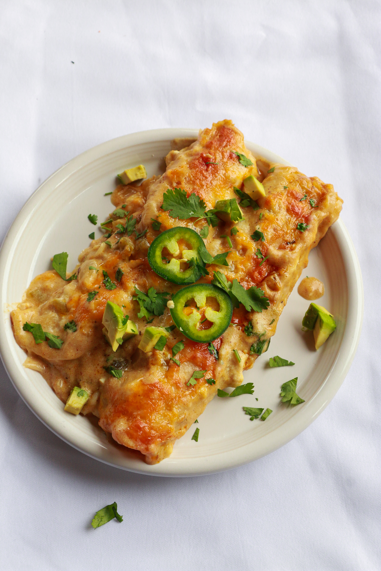 Spread ½ cup Green Chili sauce on the bottom of a lightly greased 9 x 13-inch baking dish. Spread out a tortilla shell, add about ½ cup chicken mixture to each tortilla and roll up tightly. Line them up seam side down in the baking dish. Top evenly with remaining Green Chili sauce followed by remaining cheese. I find the perfect size to be the 7-8 inch tortillas, but if you only have the larger ones, cut the ends off them after rolling to fit the pan. The ends never have any filling in them anyway!