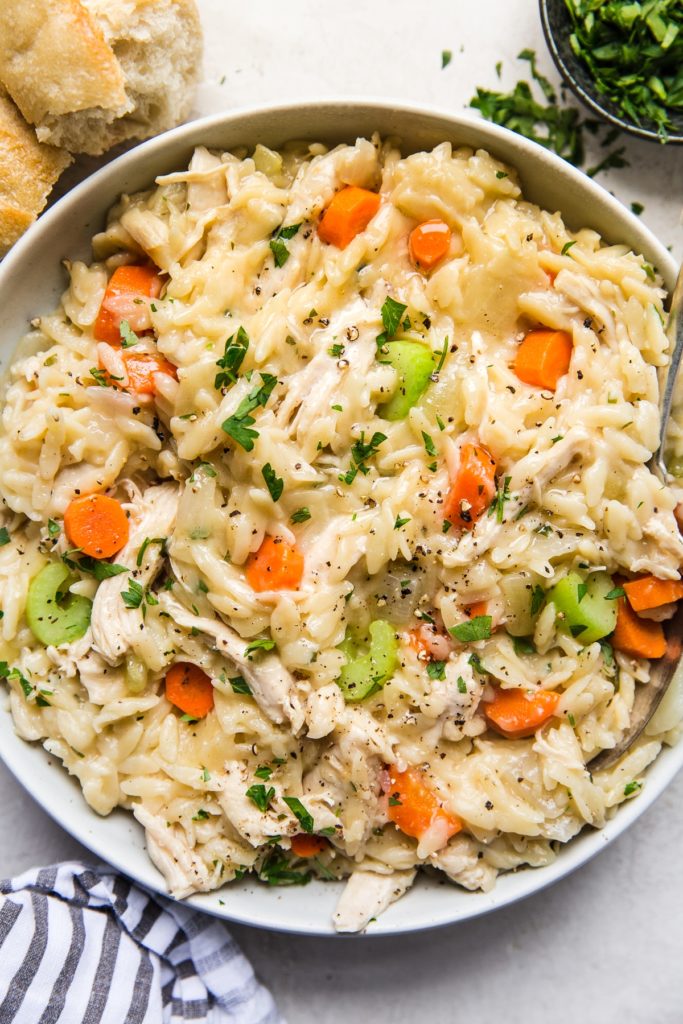 Just carrots, celery, onions and garlic flavor in this soothingly simple, risotto-like creamy chicken orzo recipe. Grab some crusty bread and call dinner done.