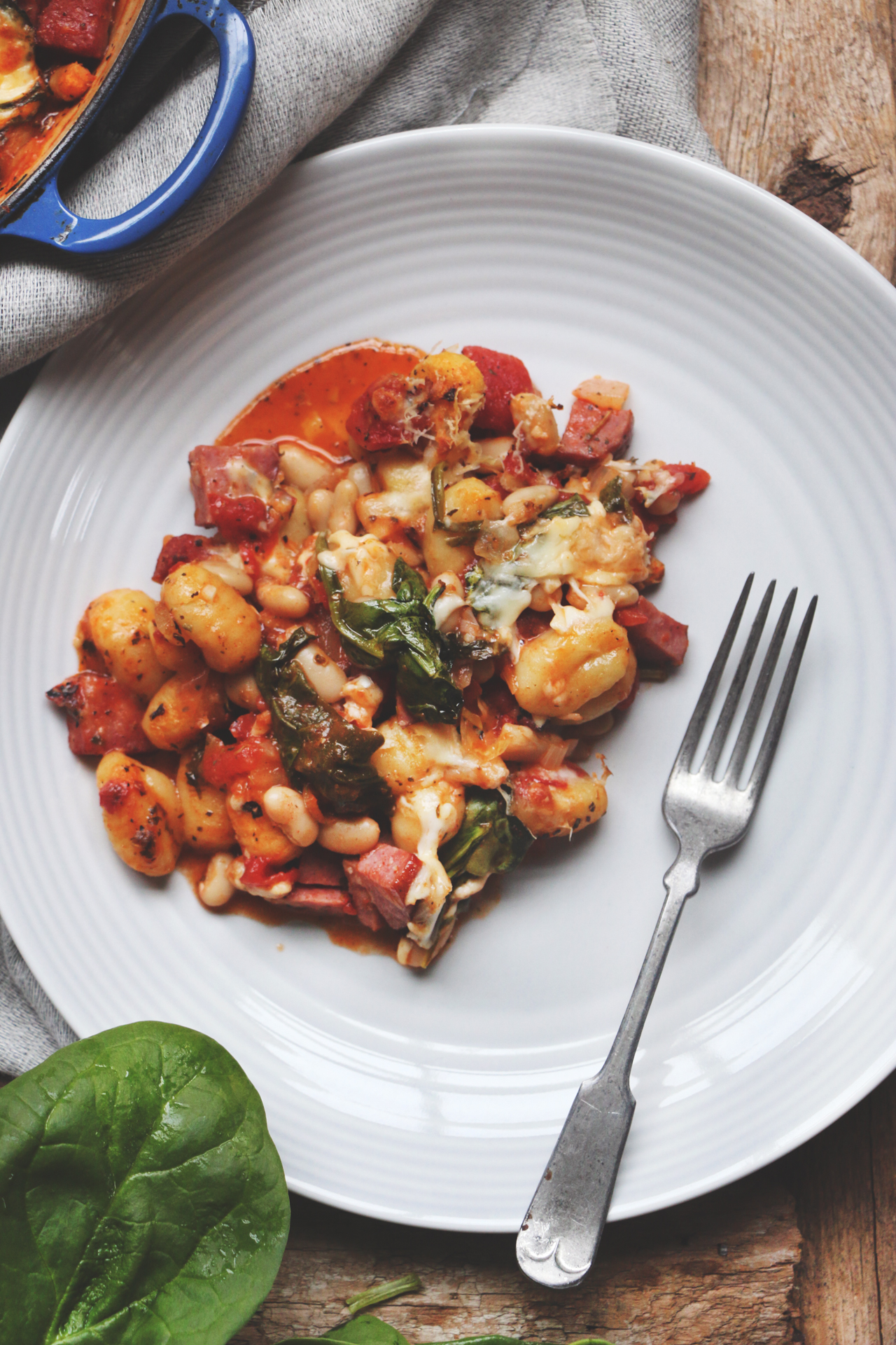 Add in the wine or broth, deglazing the pan . Add undrained Italian diced tomatoes, salt and pepper, THOROUGHLY rinsed, drained, and dried cannellini beans, and uncooked gnocchi. Stir until everything is well combined. Gently stir in the spinach and make sure it’s covered with liquid.