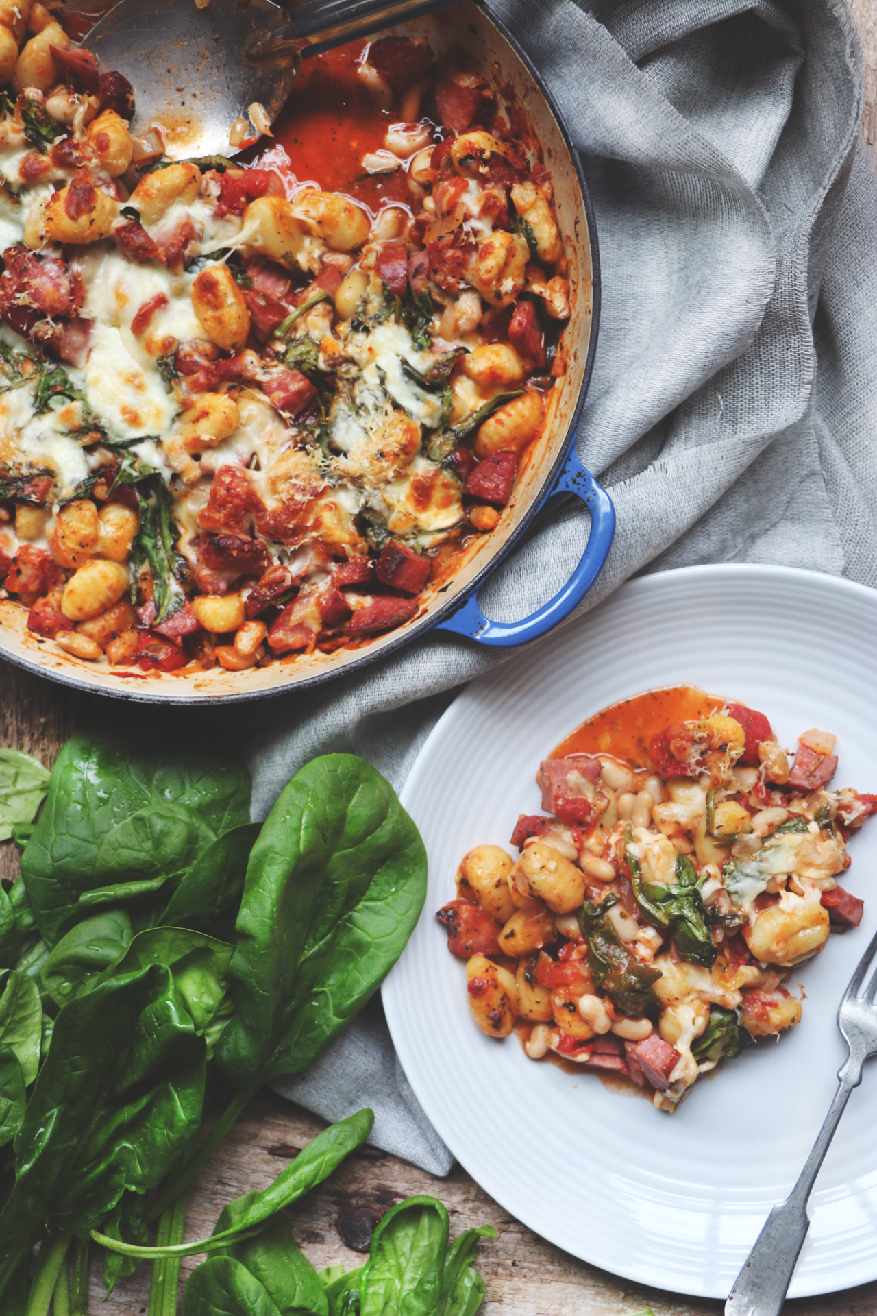 Add in the wine or broth, deglazing the pan . Add undrained Italian diced tomatoes, salt and pepper, THOROUGHLY rinsed, drained, and dried cannellini beans, and uncooked gnocchi. Stir until everything is well combined. Gently stir in the spinach and make sure it’s covered with liquid.