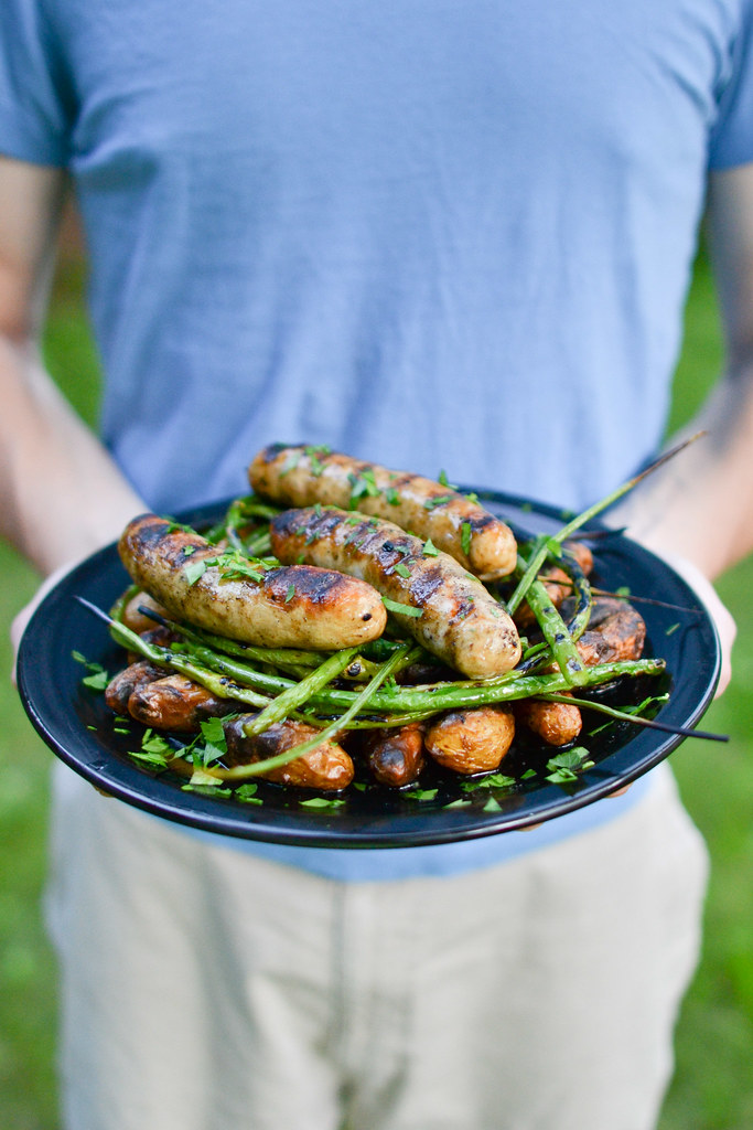 Grilled Sausages with BC Warba Potatoes and Garlic Scapes