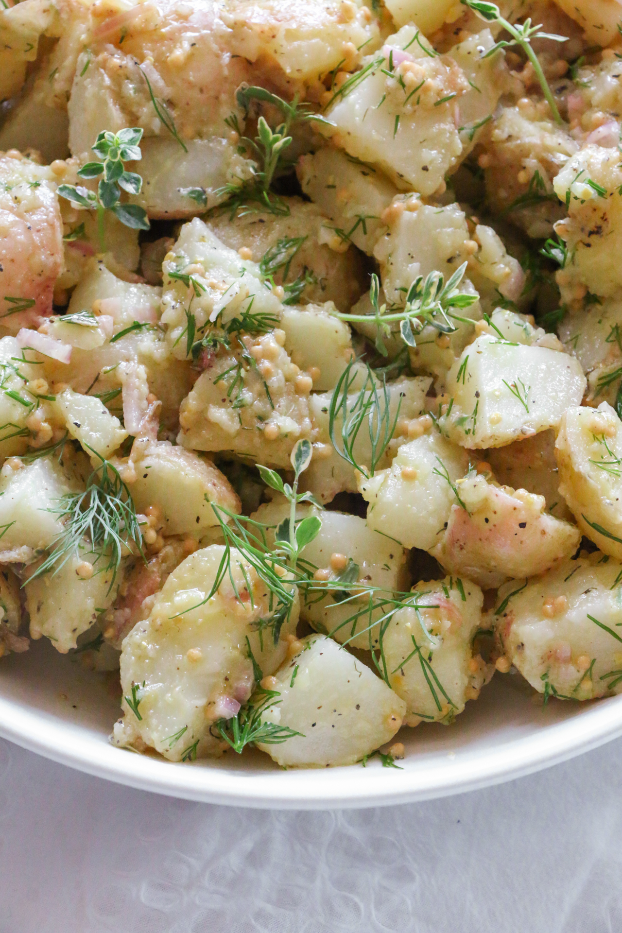 Meanwhile, whisk together olive oil, lemon juice, garlic, mustard, salt, and pepper until combined. Add potatoes, dressing, shallots, and herbs to a large bowl, and toss gently until evenly combined. Taste and season with additional salt and pepper if needed.