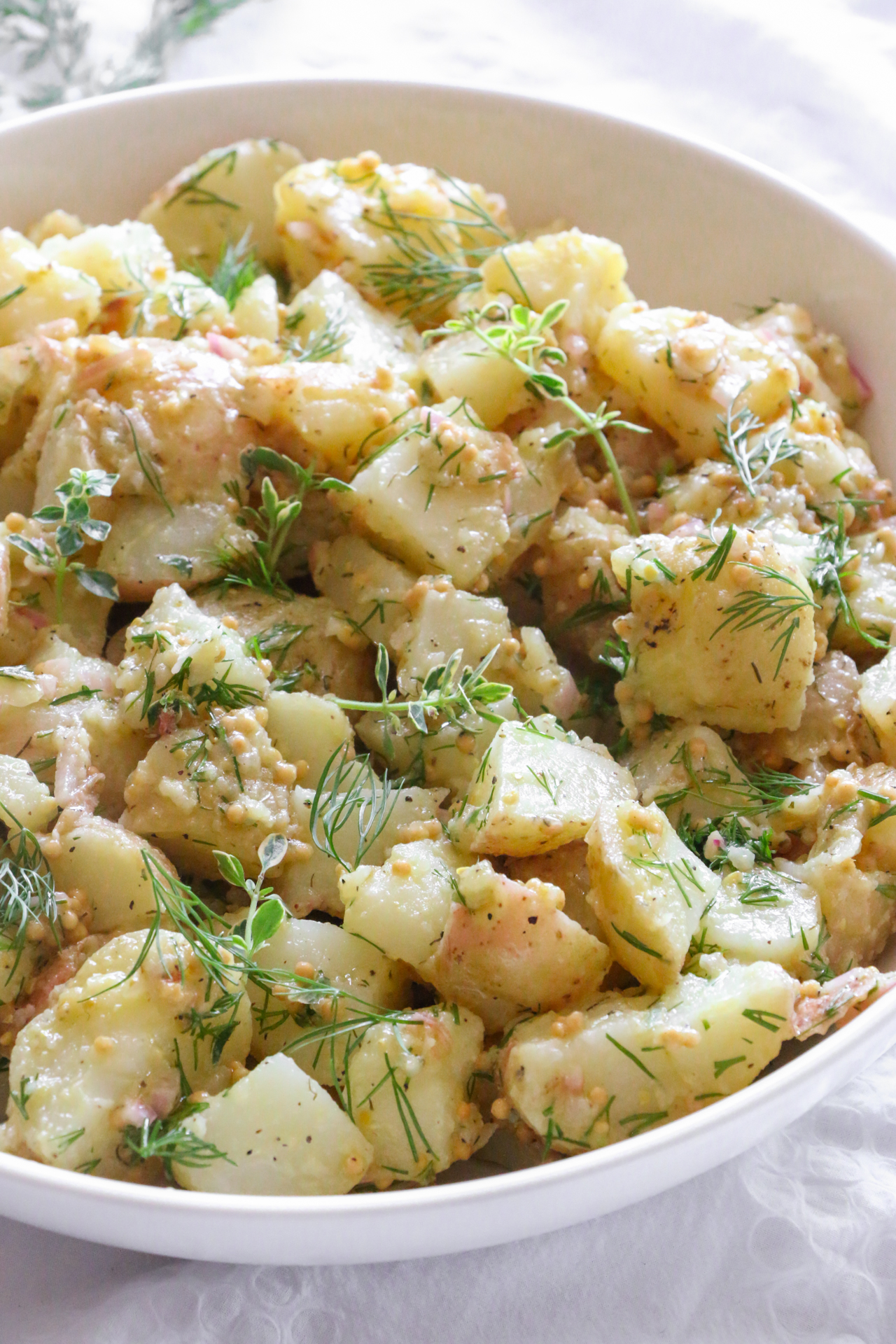 Meanwhile, whisk together olive oil, lemon juice, garlic, mustard, salt, and pepper until combined. Add potatoes, dressing, shallots, and herbs to a large bowl, and toss gently until evenly combined. Taste and season with additional salt and pepper if needed.