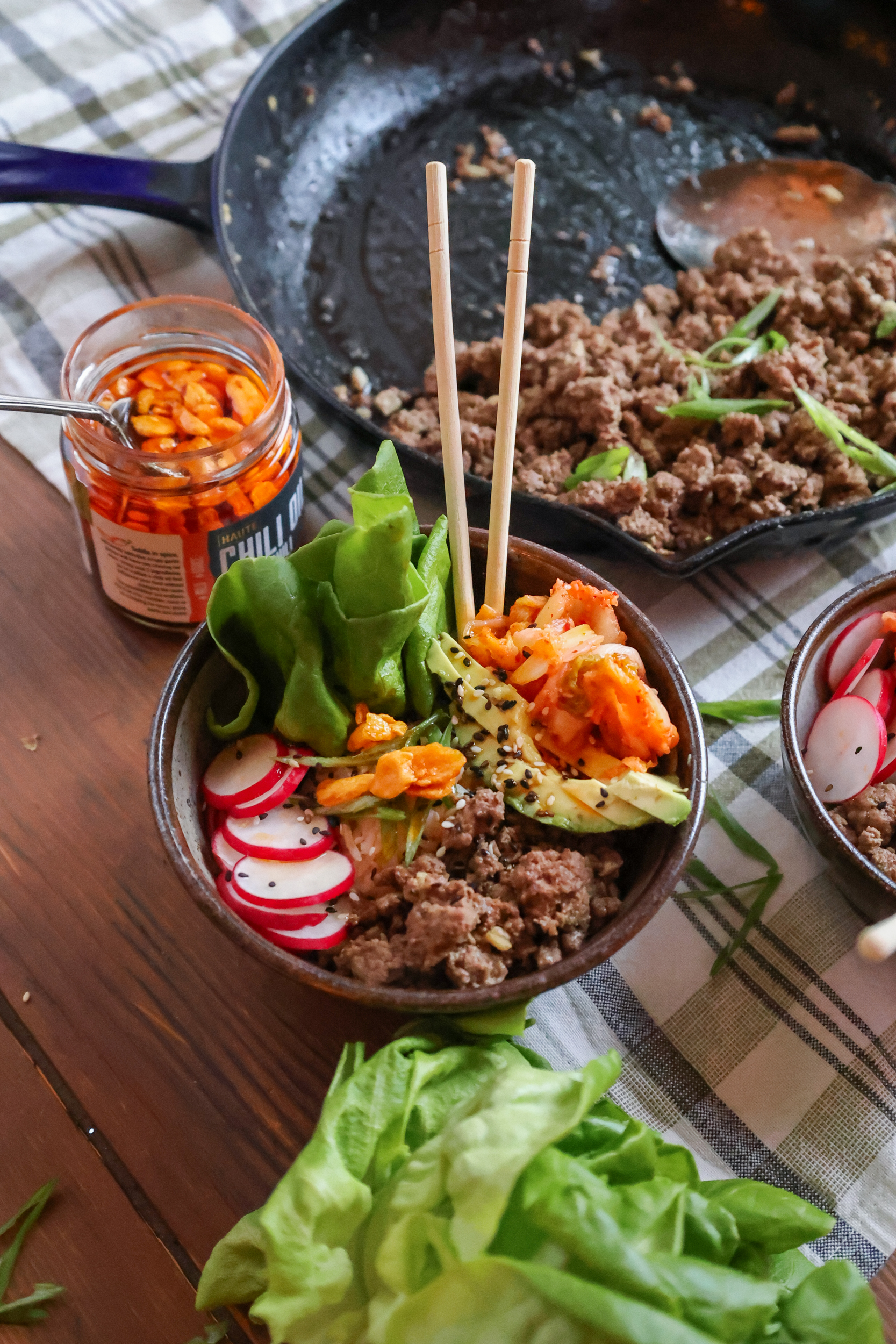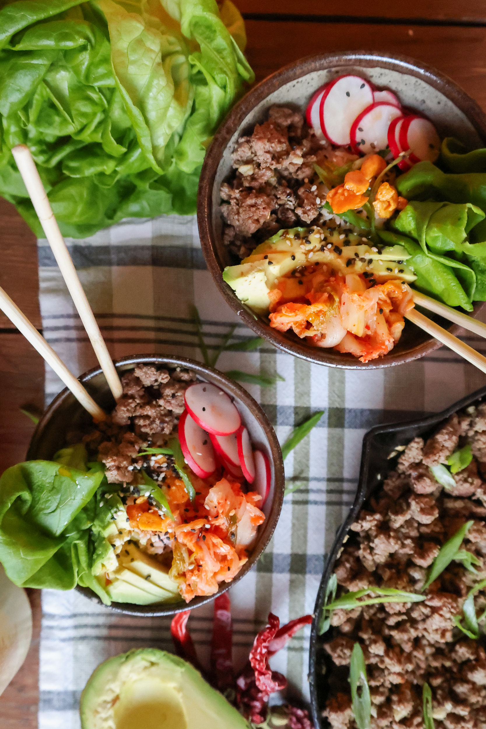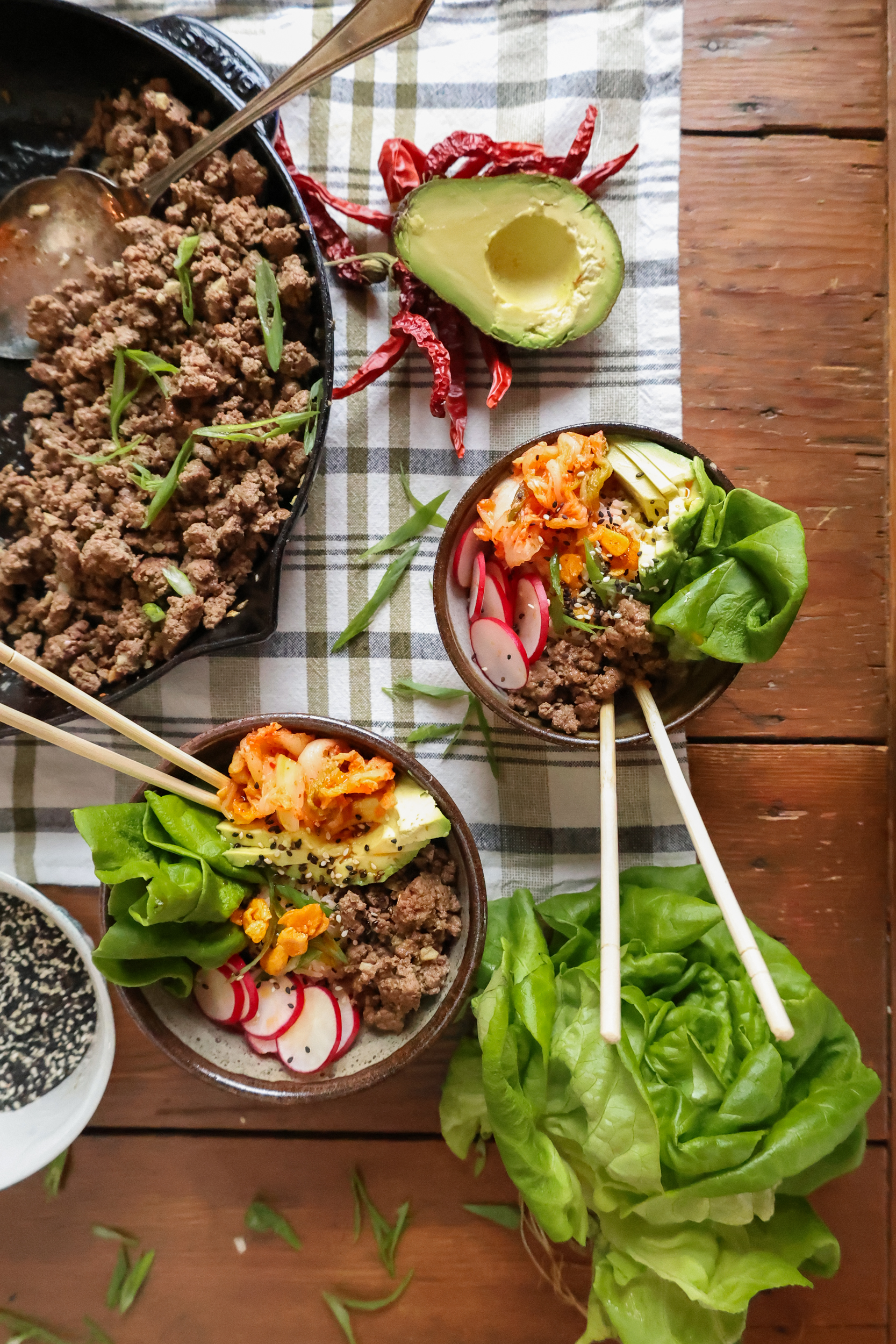 This recipe couldn’t be easier or more delicious! The only thing you have to do is quickly cook the ground meat and chop a few toppings. The rich flavour of beef pairs really well with the bright kimchi but you can switch to ground chicken, turkey or pork if you prefer. The kimchi provides a source of fibre and probiotics, which is supportive of your gut health!