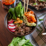 Time to assemble the bowls! Layer the beef on top of the rice and then add the suggested toppings in whatever amounts you prefer! Drizzle a bit of soy sauce on top, season with salt and pepper if needed and enjoy!