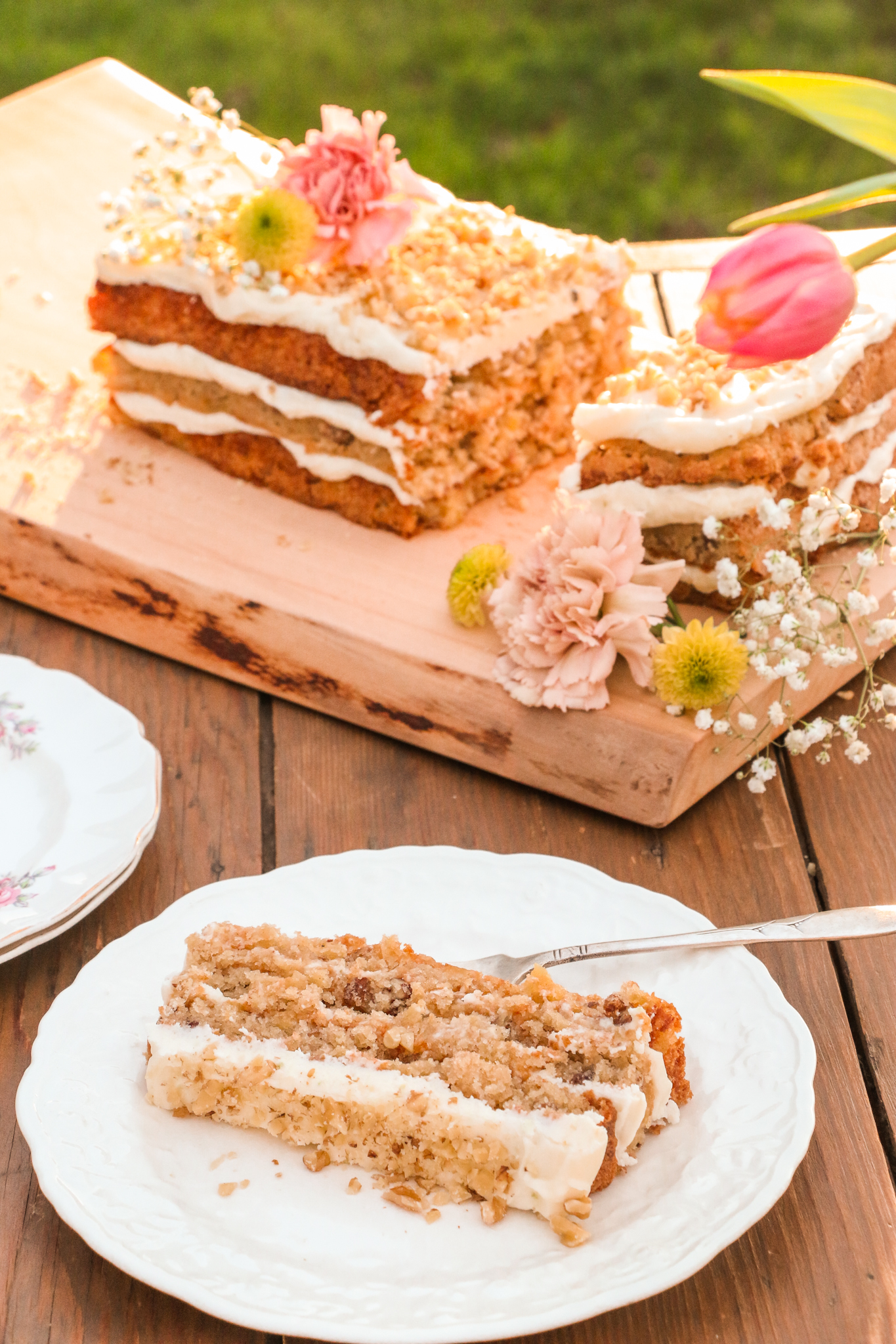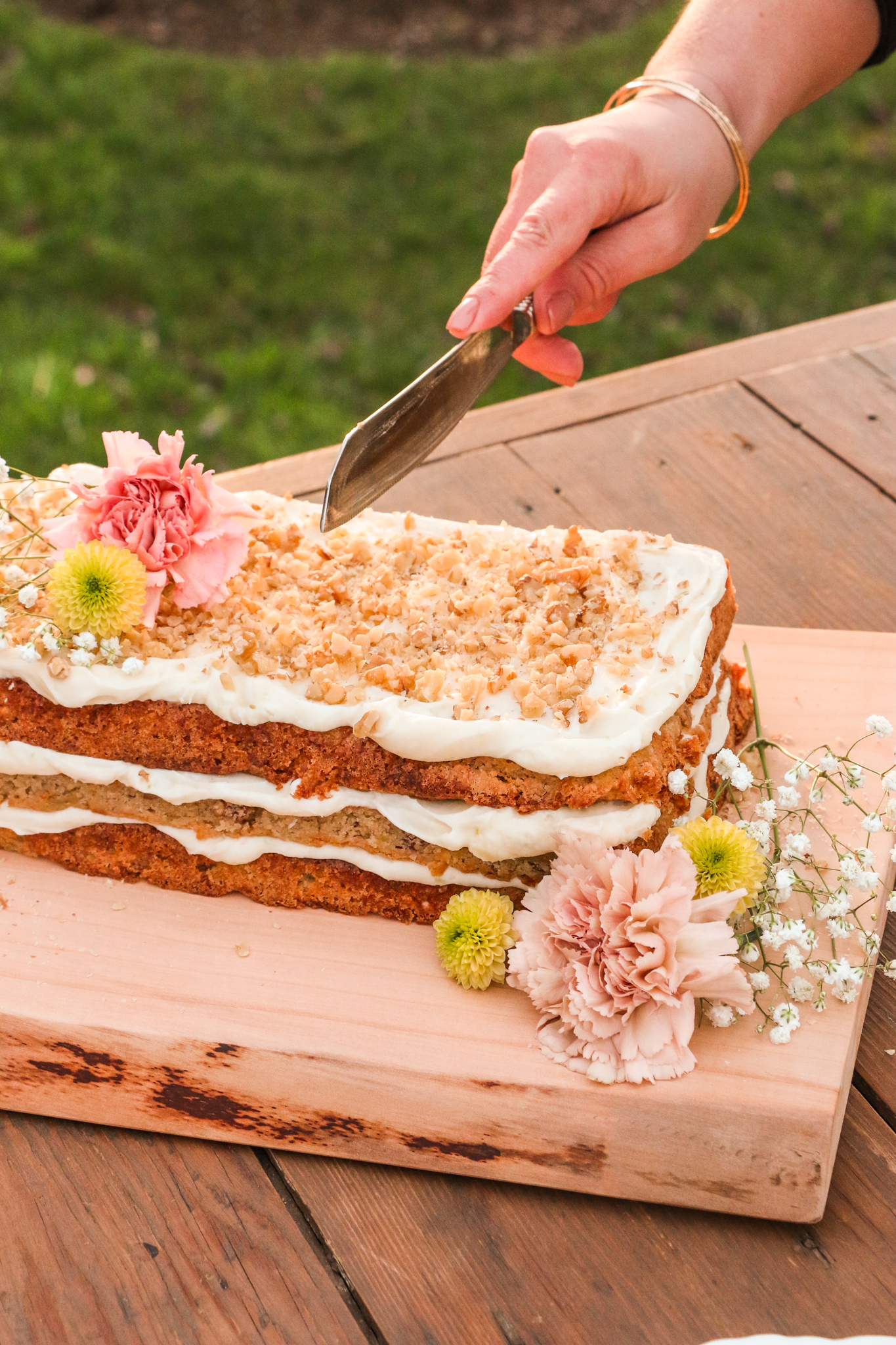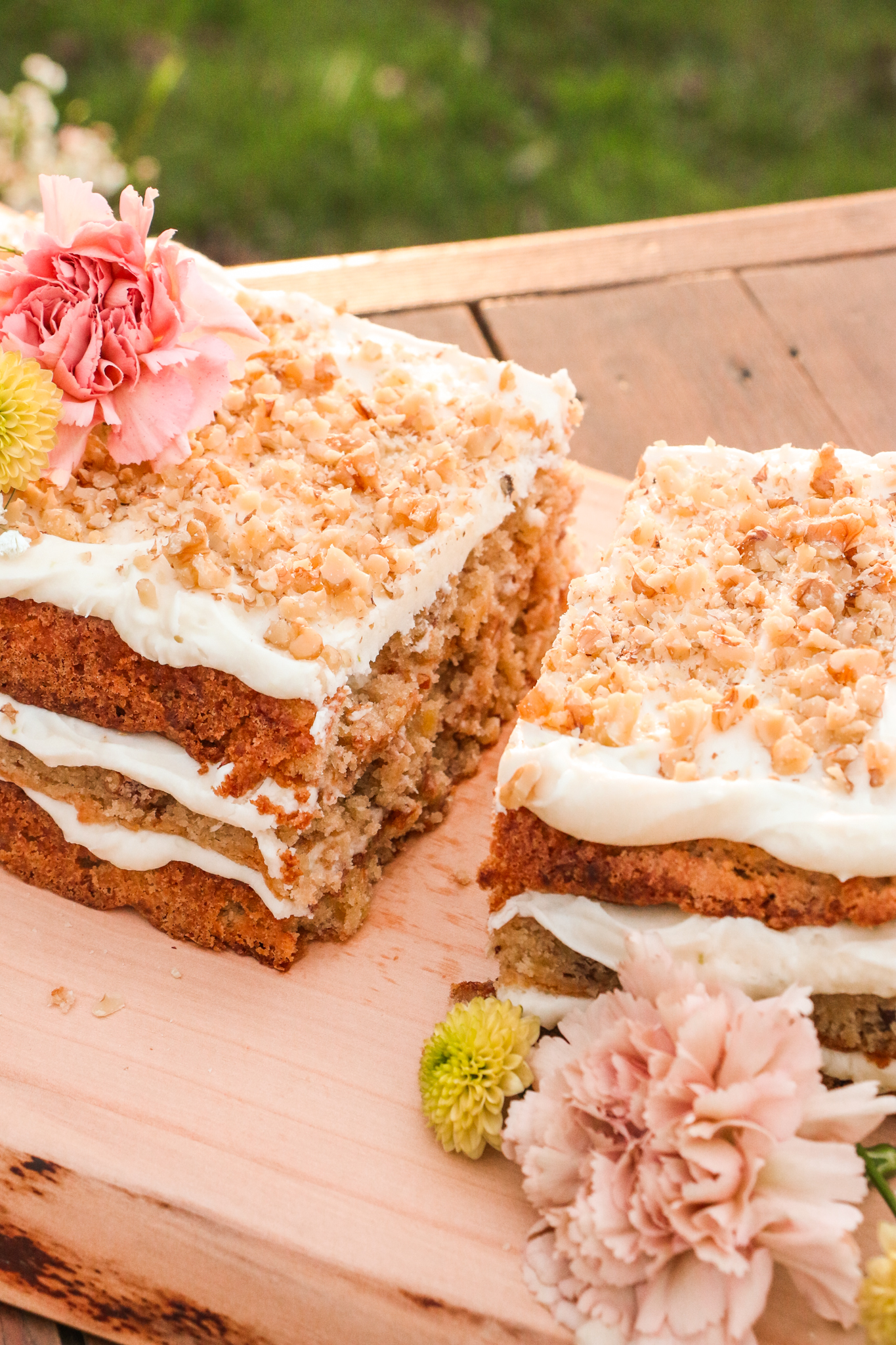 This cake can be easily baked the day before the event, saran wrapped and iced, and assembled the following day. It has plenty of moisture from the pineapple and banana. It makes a wonderful birthday cake or dessert for Easter or Mother’s Day.