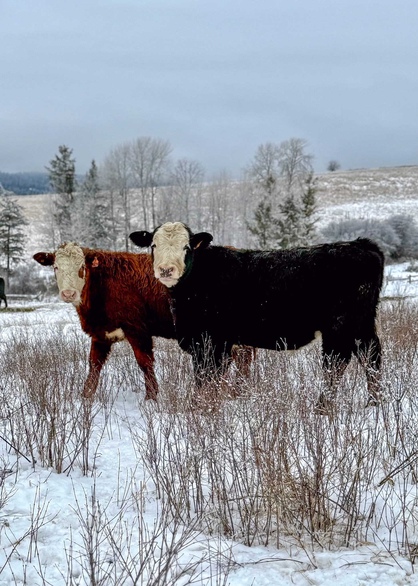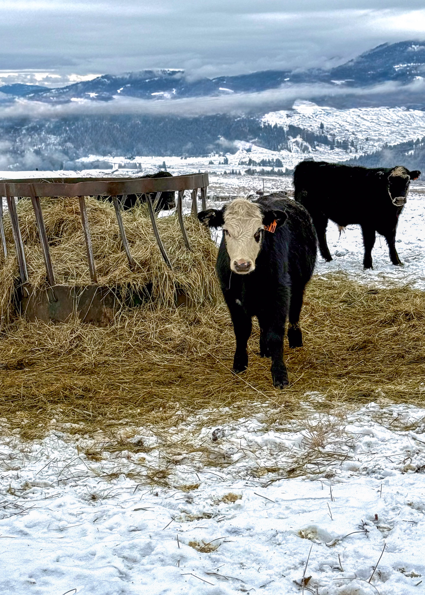 Our cows are Black Angus Triple A, a breed known for high-quality meat with superior marbling, tenderness, and flavour. The cattle roam freely over thousands of acres of ranch and crown land in the summer, grazing on its lush grasses. In the winter, and are finished on a diet of hay, silage, and barley at the Ranch, where they enjoy spacious and dry conditions.