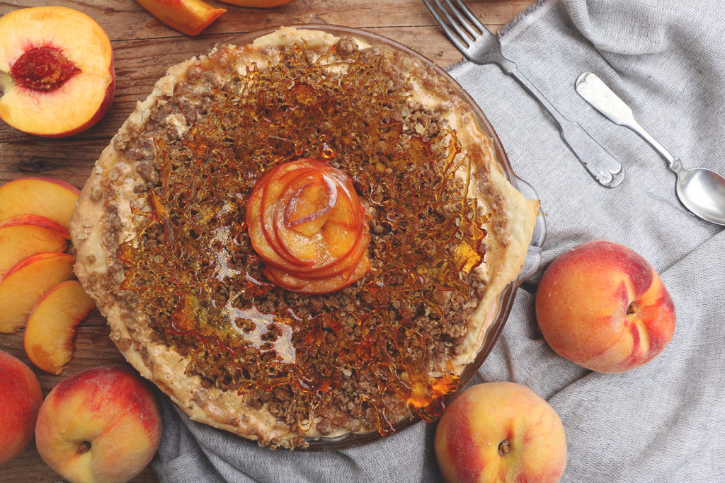 Bourbon Caramel Soaked peaches atop a bourbon crust, crowned with browned butter, bacon & pecan crumble and bacon rosettes.