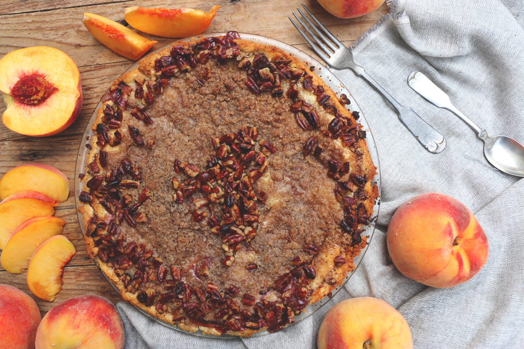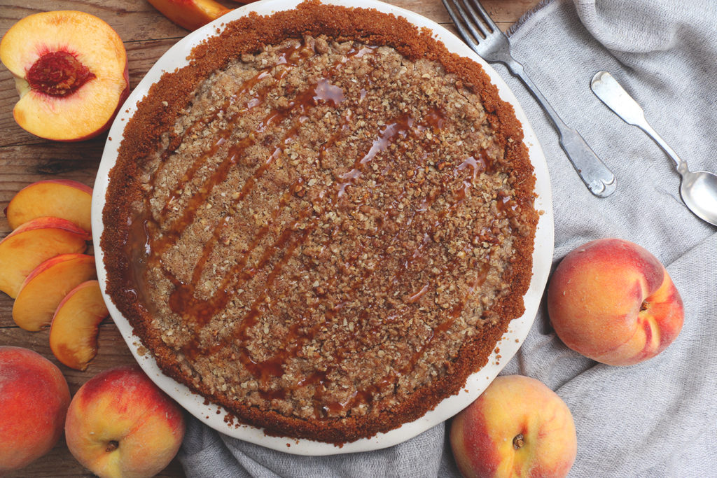 A gingerbead cookie & graham crust with a fresh peach filling. Crumble praline topping with caramel drizzled on the top.
