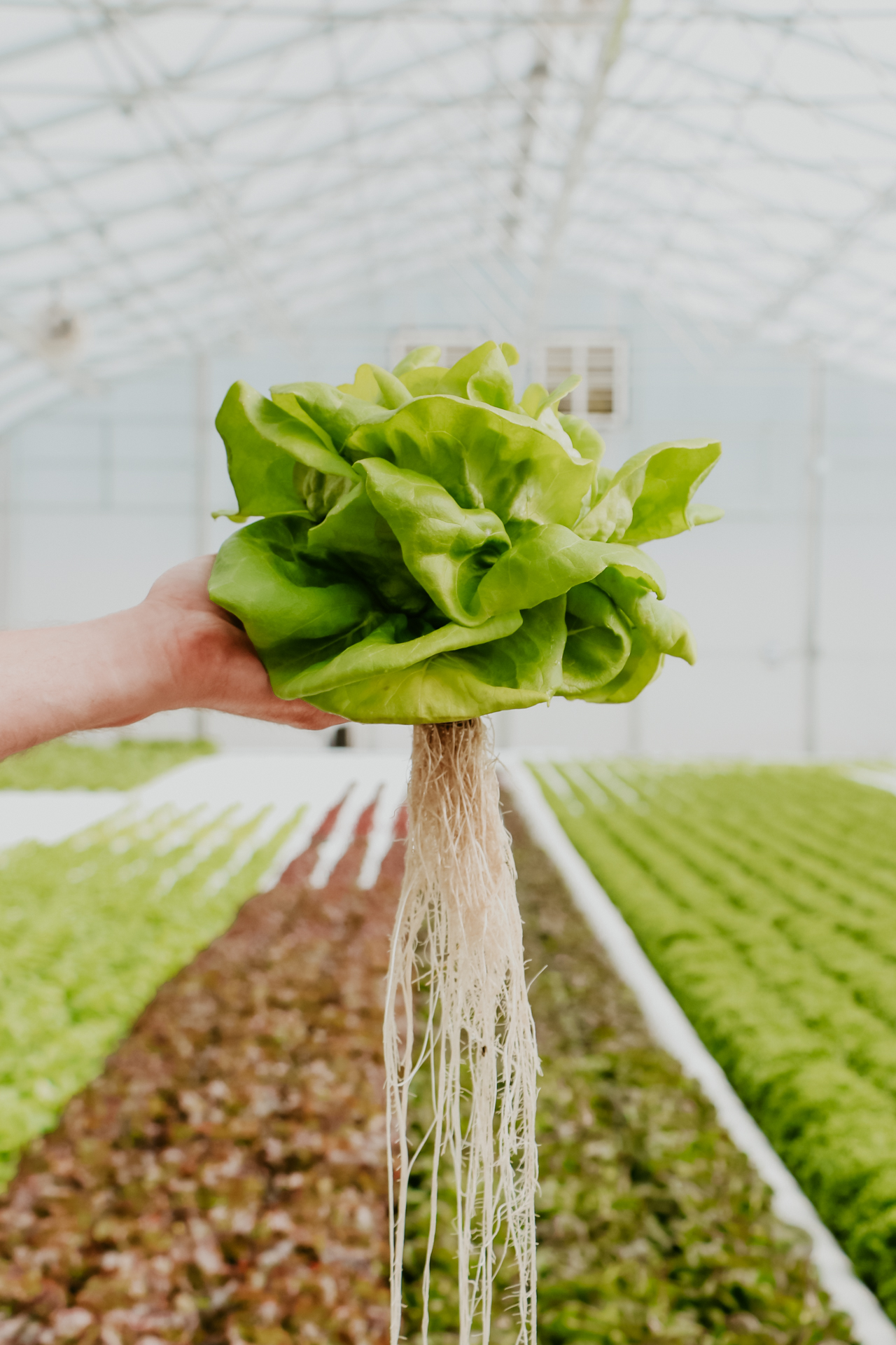 Our lettuce and kale uses a method called hydroponic deep water culture. What does this mean? The lettuce sits on top of rafts that float in a pool of water. With the roots having continuous access to the water they soak up all the nutrients it needs throughout their growth period. At approximately 5 weeks of maturity, the lettuce & kale is harvested with the roots intact and brought directly to the market. To keep it fresh longer, we recommend storing it in water in your fridge.