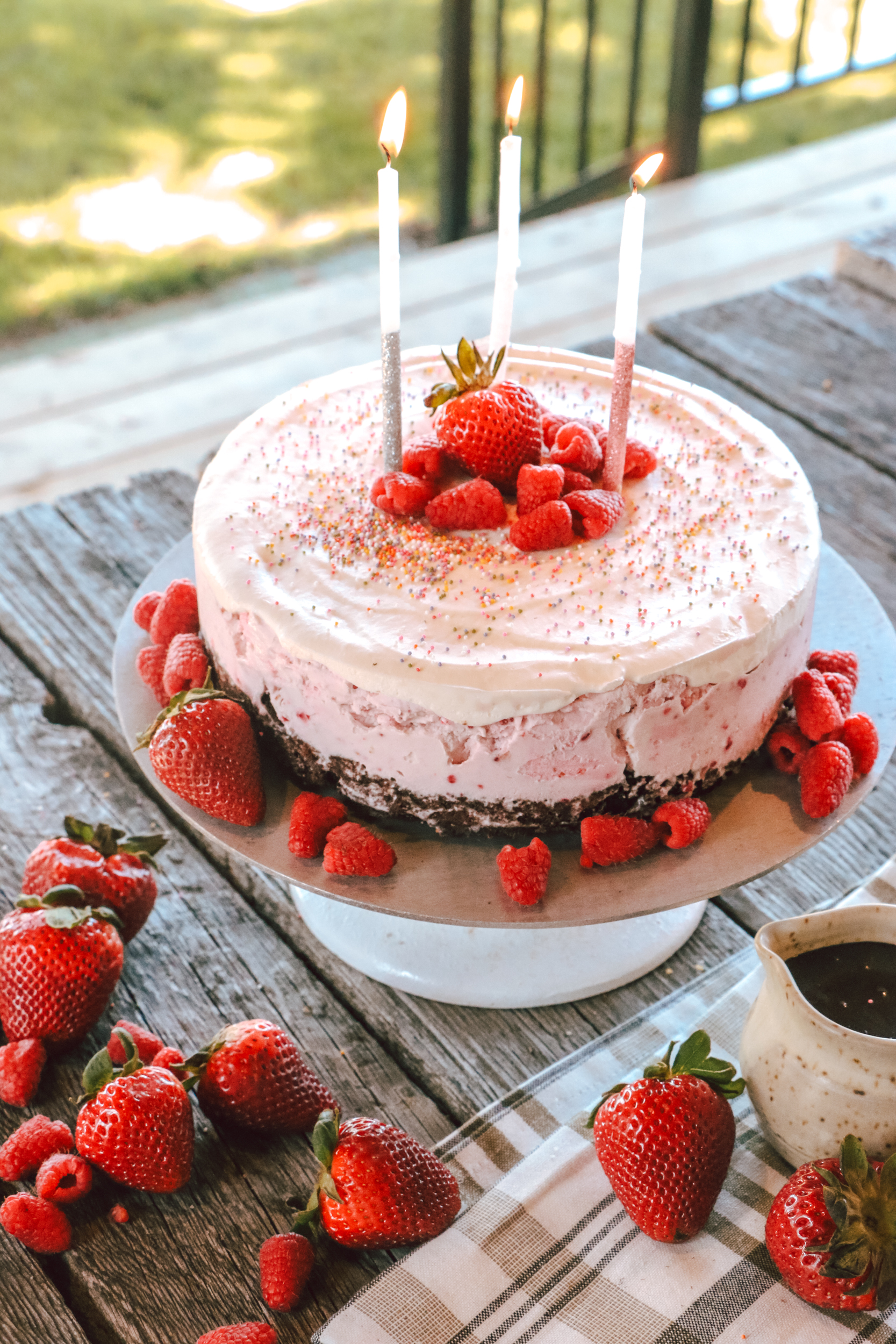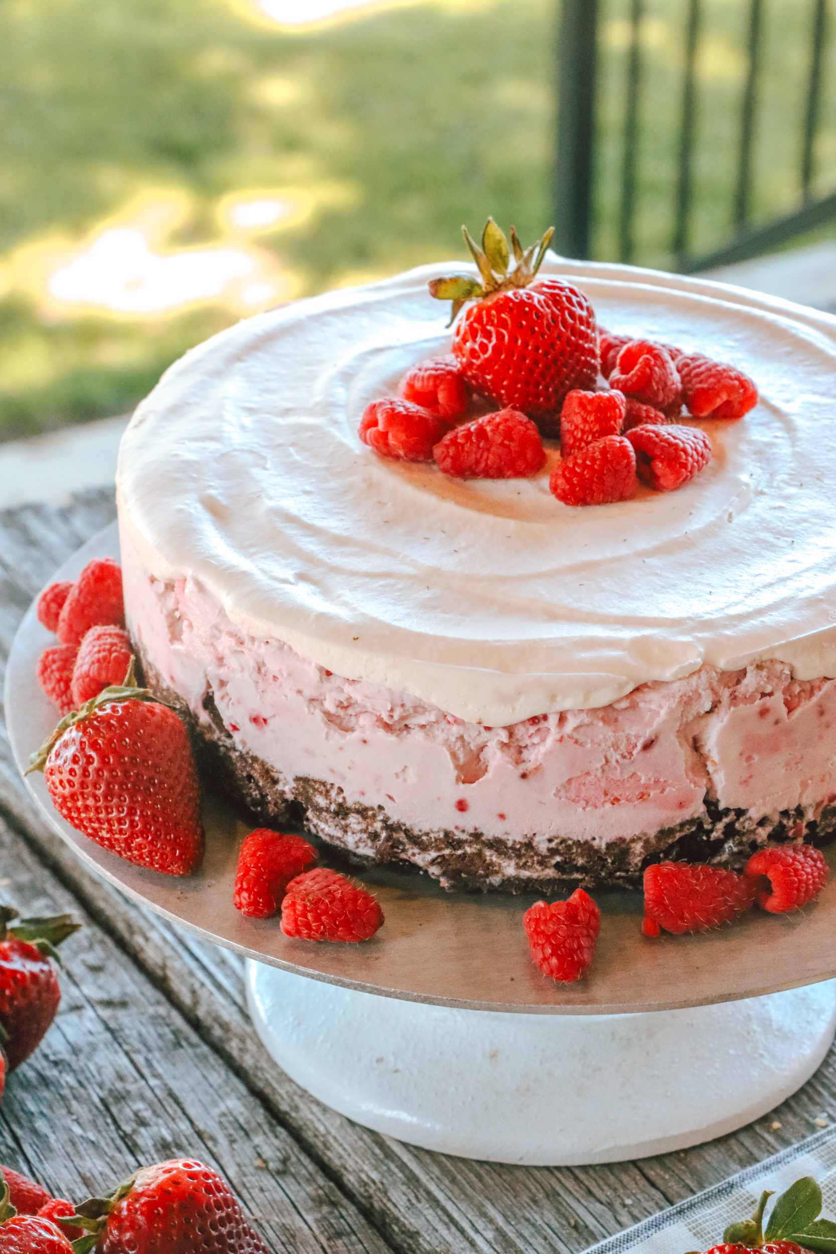 This cake is a delicious summer treat! Summery fruit, creamy ice cream, and decadent chocolate come together to form the perfect slice! It’s great for serving at your next family gathering or making for a birthday celebration. You can even customize it and top it with your favorite fresh fruit!