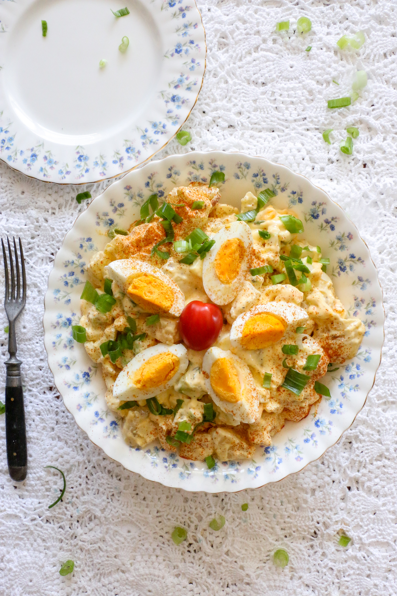 Cut peeled, reserved egg into equal pieces and place into a flower shape on top of the salad. Add a cherry tomato for the center. Dust with paprika.