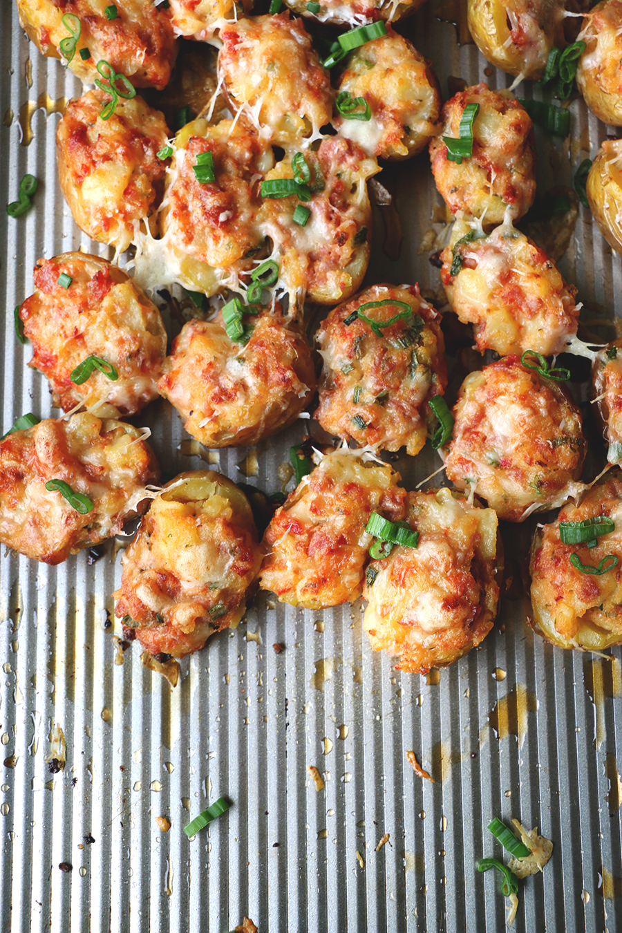 Once cool enough to handle, cut them in half lengthwise and scoop out the insides leaving a small layer. A melon baller or small appetizer spoon works best for this. Place the potato flesh into a medium-sized bowl. Place the skins on a parchment lined tray.