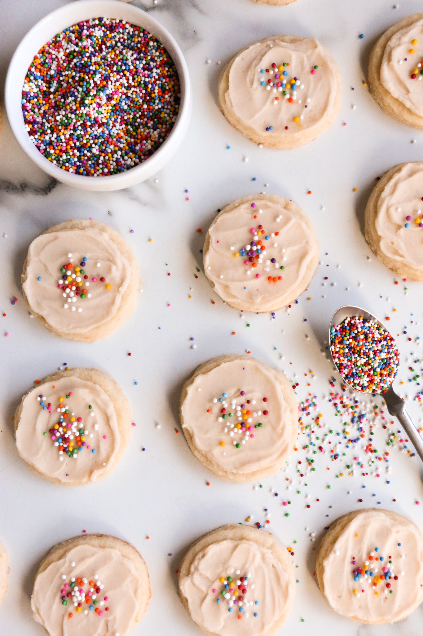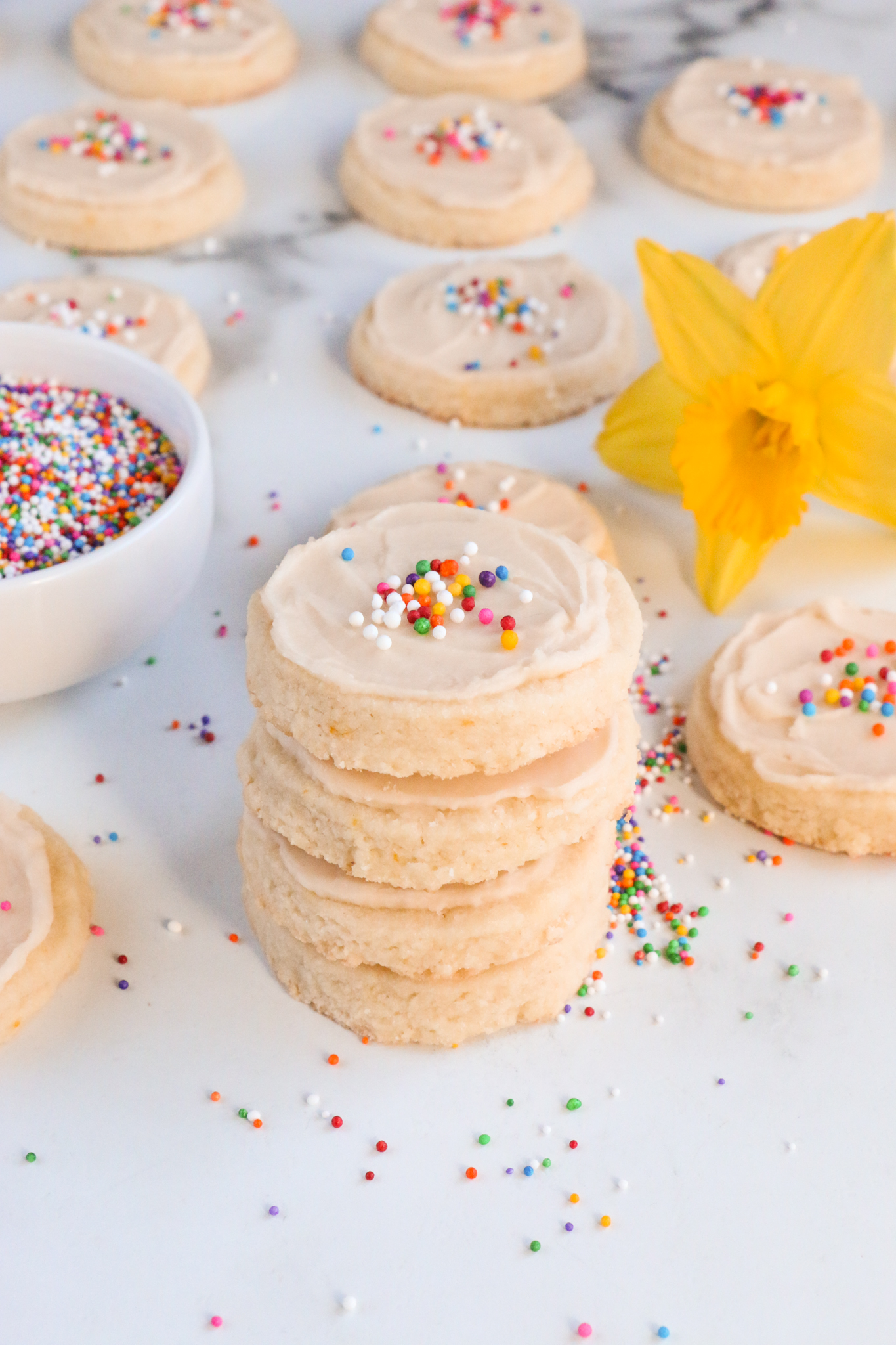 At this point, you can get your hands into it and bring the dough together (It may not seem like it will stay together, but just keep working at it until it does). Place on a floured surface and roll the dough out until it’s around a 1/4 inch in thickness. Using a 2 inch round cookie cutter, cut the dough and place on a parchment lined baking sheet. Chill for about 20 minutes to help stop spreading.