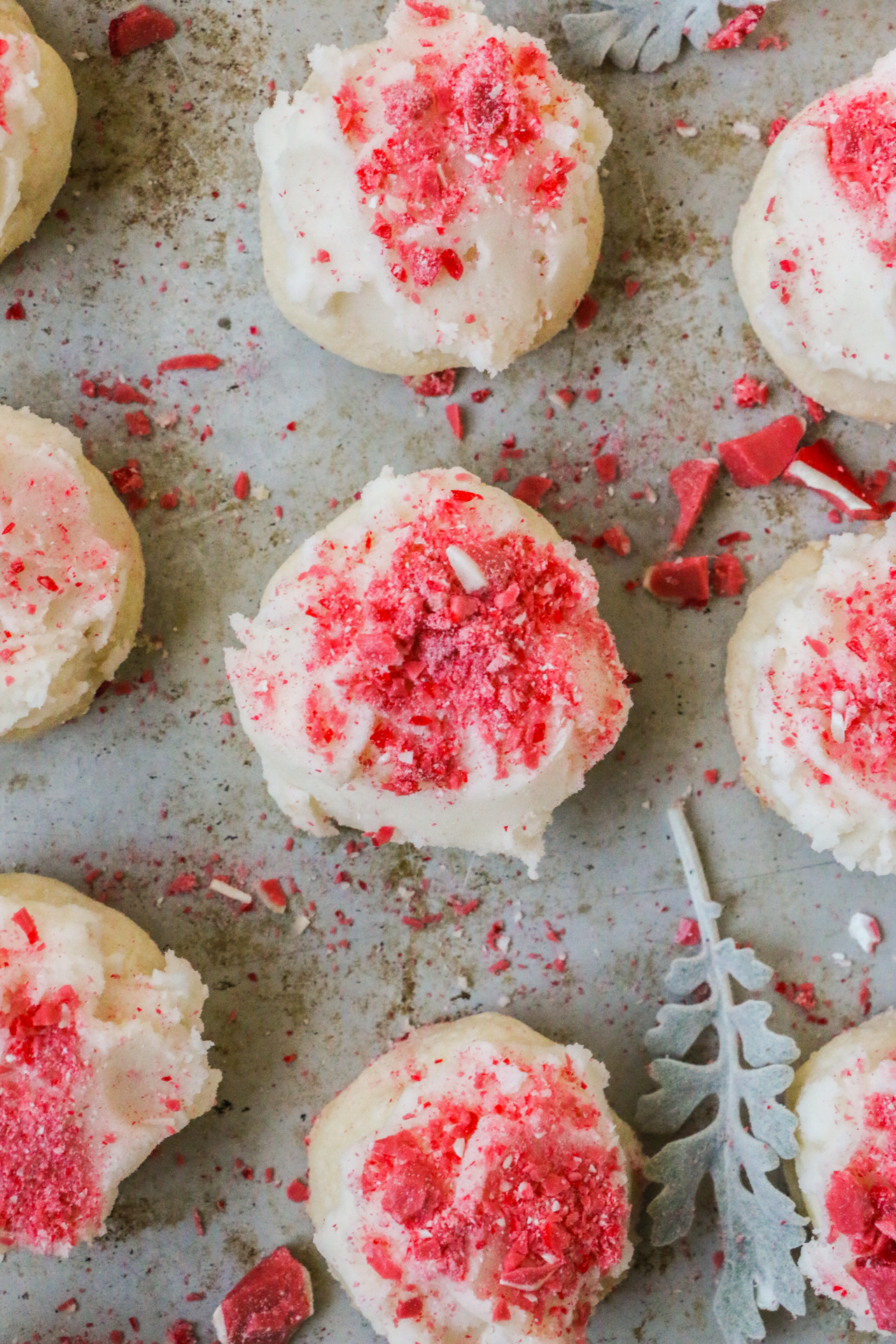 Using a stand or hand mixer, cream together butter, half and half, peppermint extract and powdered sugar until light and fluffy. Working with one cookie at a time, spread the frosting over the cookies and add crushed peppermint bits before the frosting starts to set, repeat the process with all cookies.