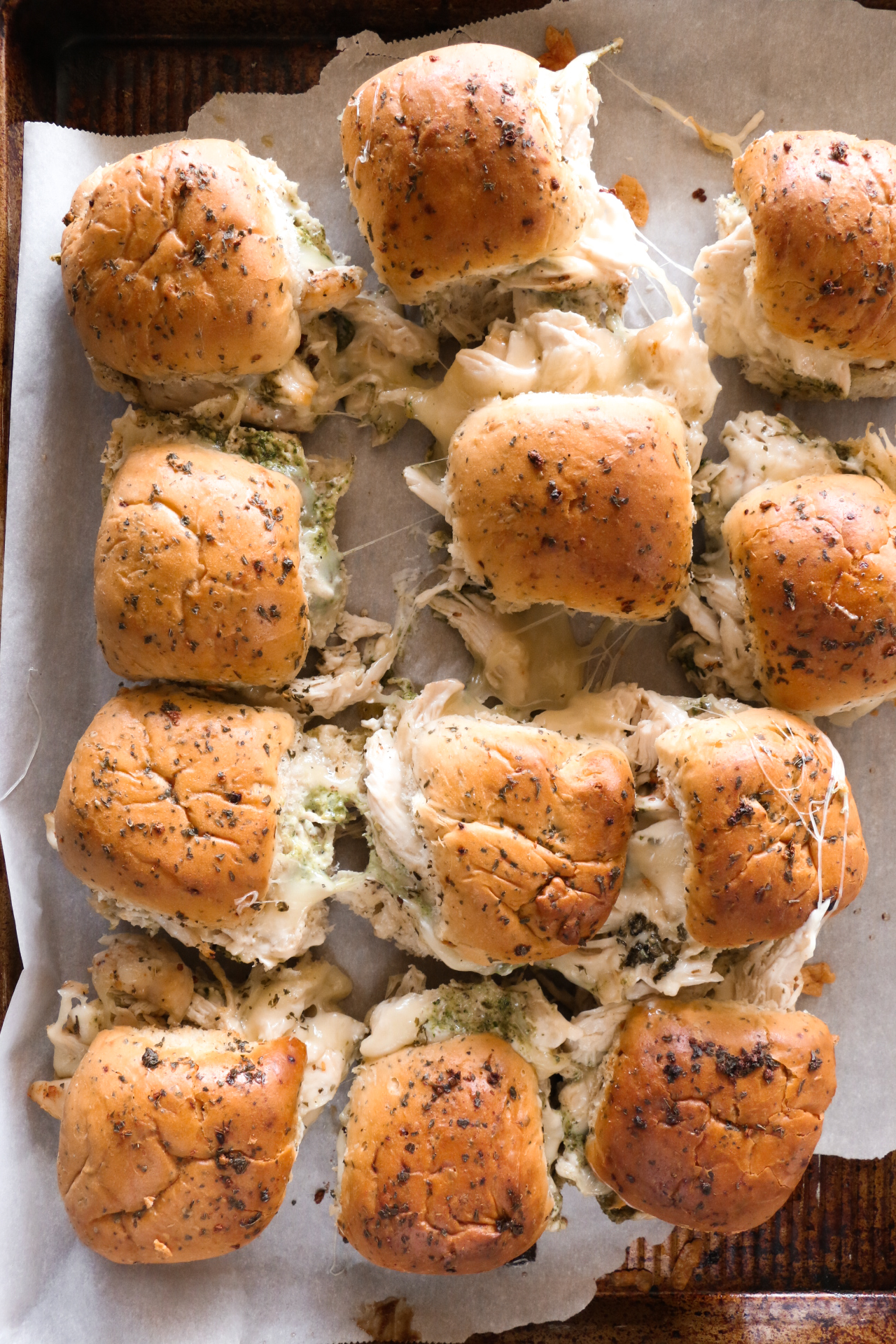 Slice the dinner rolls in half without separating the rolls. Place the bottom halves onto a baking sheet lined with parchment paper.