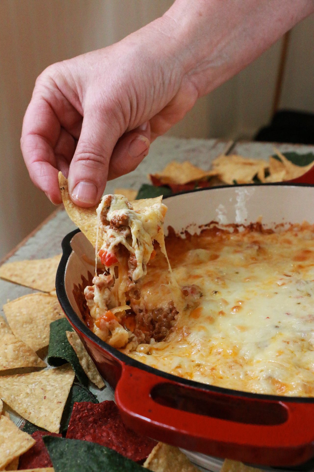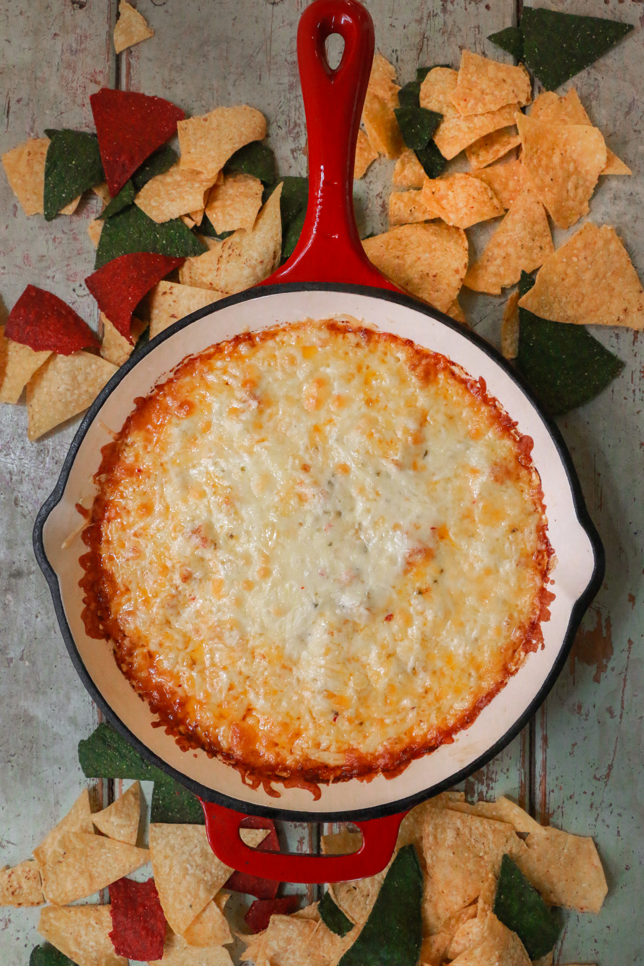 Place in oven and bake for 10-15 minutes, just until cheese is melted right to the middle. It will start to get stringy if baked too long, so watch carefully. Remove from oven and serve immediately with tortilla chips or soft taco shells.