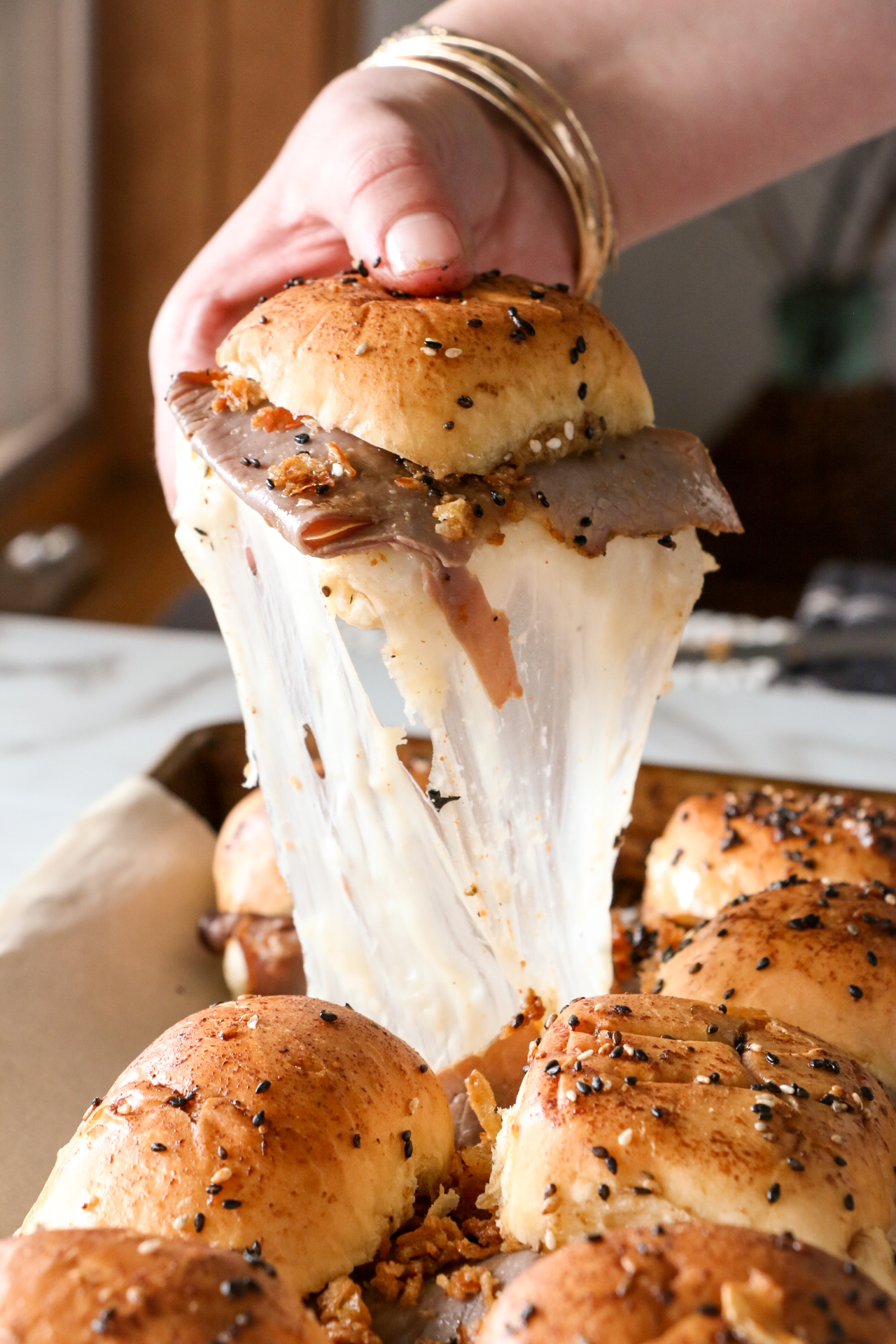 Place the tops of the dinner rolls onto the sliders.