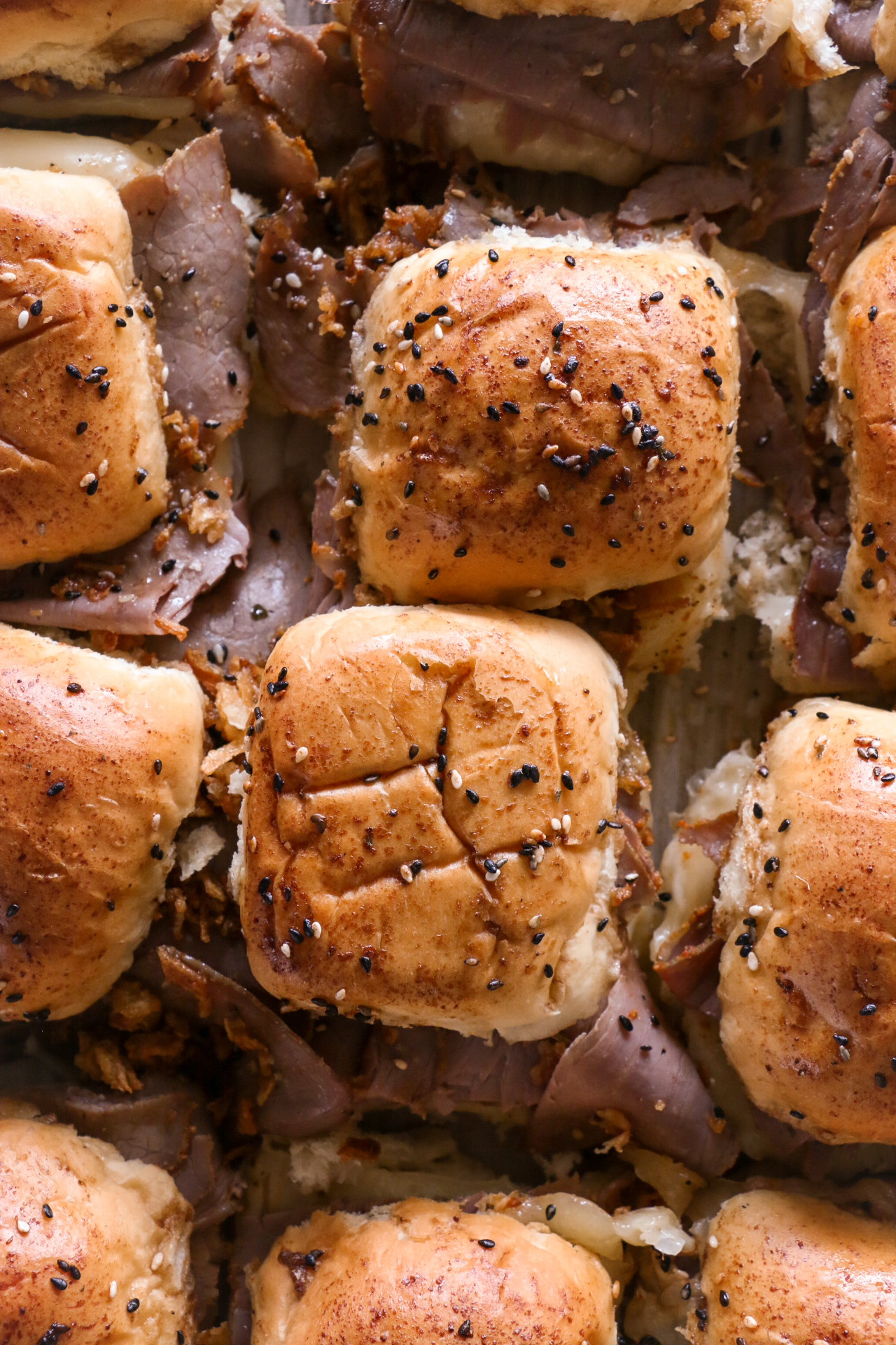 Lay 6 slices of provolone cheese and roast beef onto the bottom halves of the dinner rolls. Top with crispy onions and the remaining 6 slices of provolone.