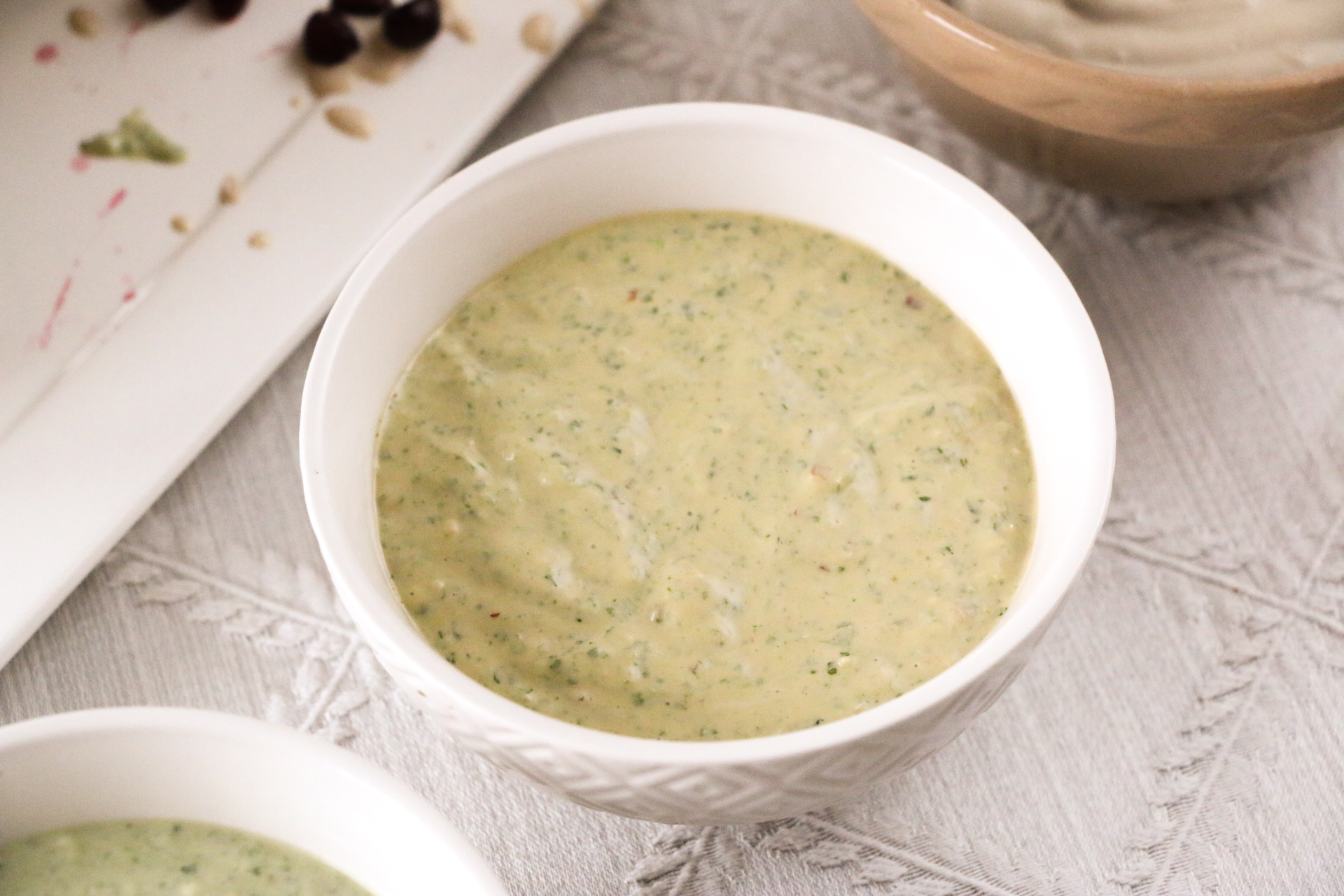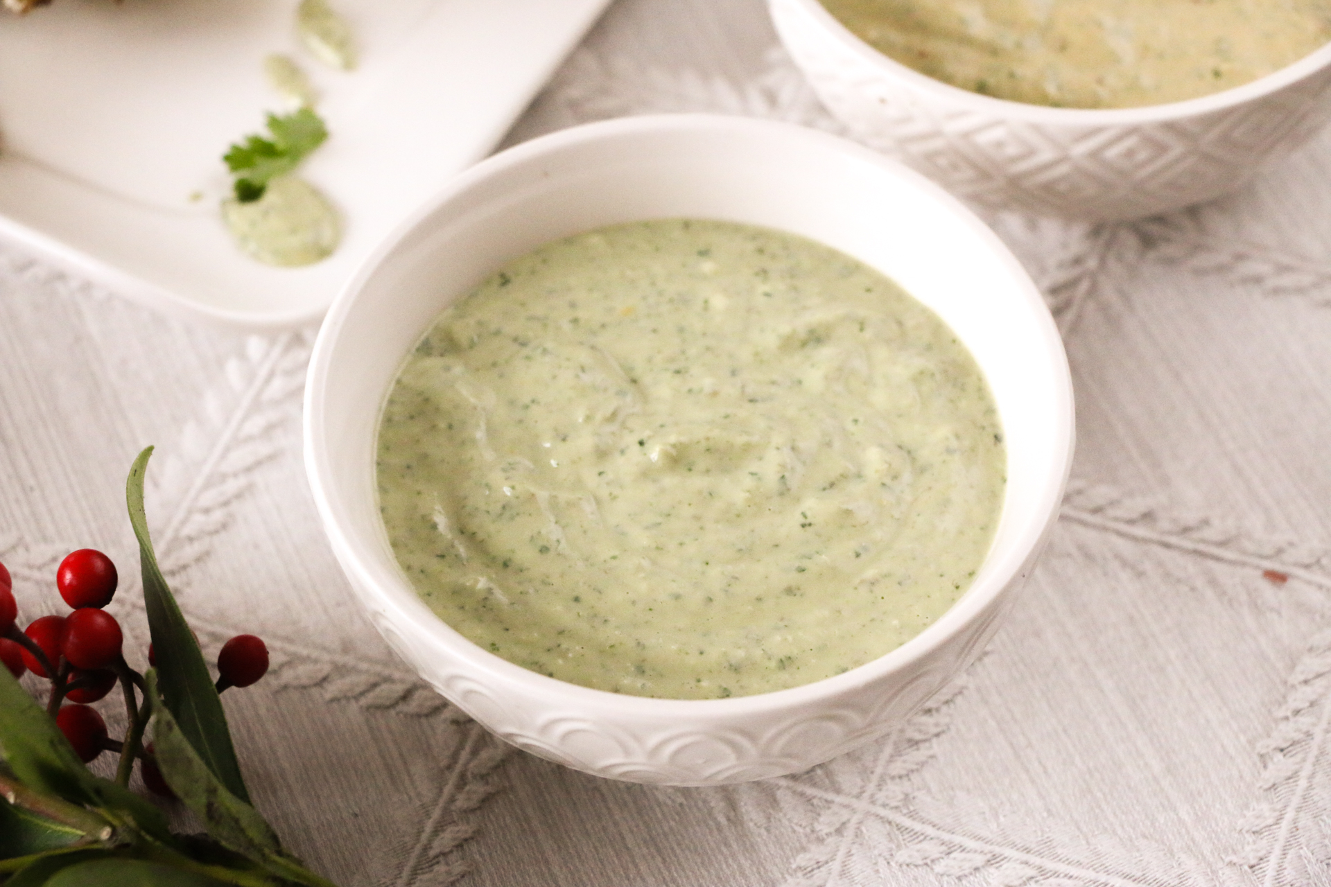 Combine all ingredients in a food processor except for the mayo and yogurt, and puree until combined. Add mayonnaise and yogurt and pulse until combined. If you want more of a drizzle, cut back the yogurt by a few tablespoons, and substitute a bit of milk or cream.