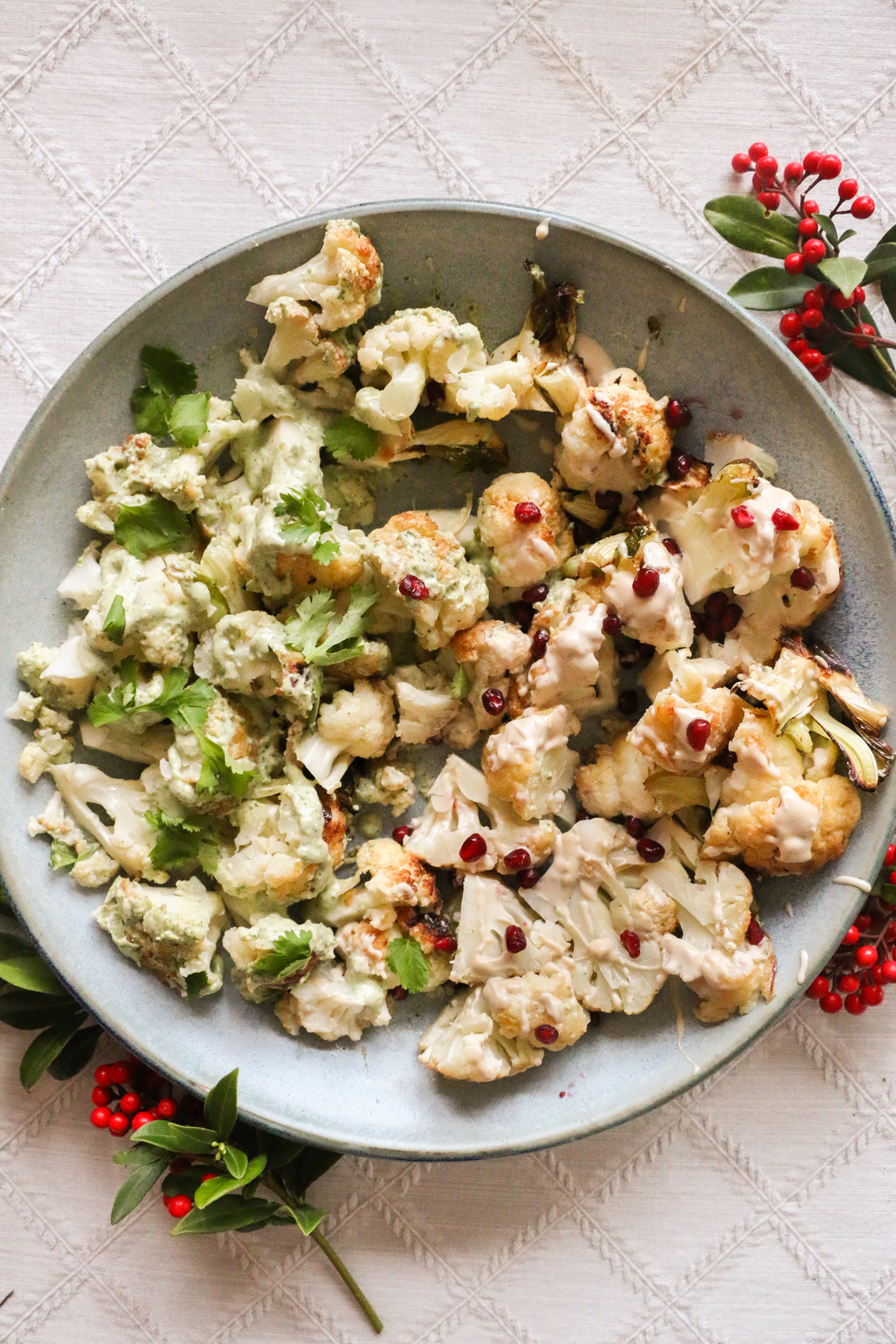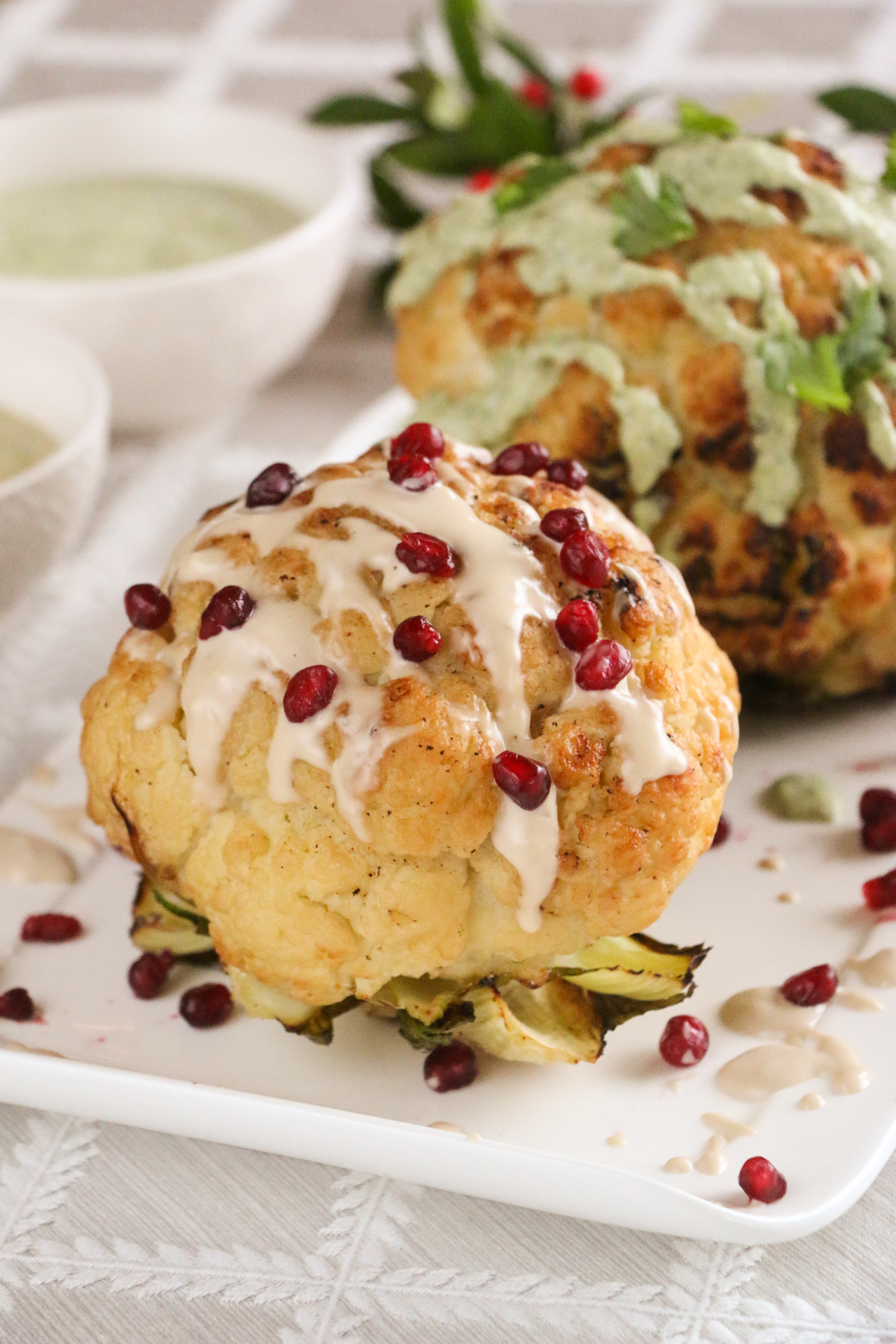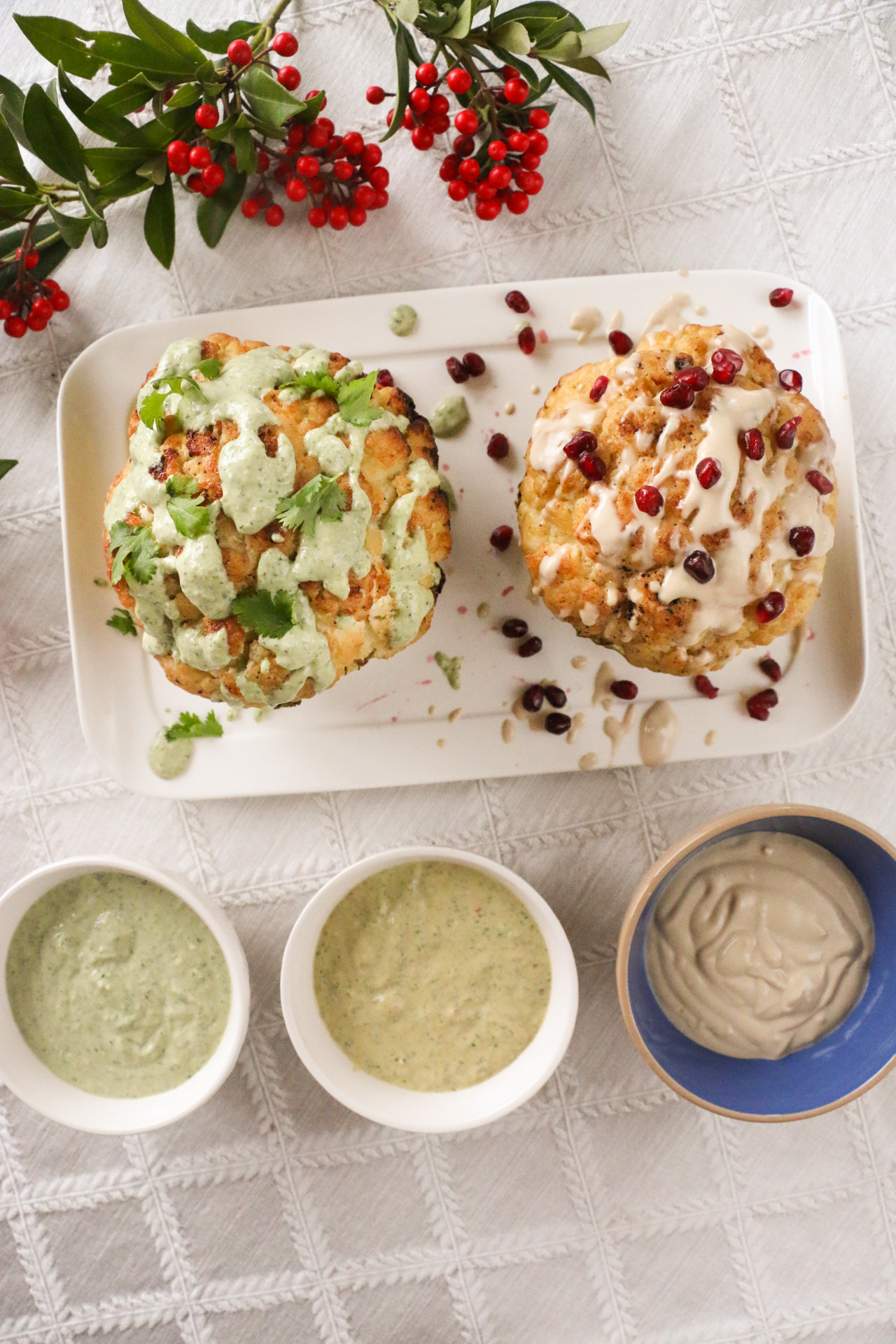 Place cauliflower, floret side up, on a parchment-lined roasting pan. Mix softened butter and olive oil together and brush on the whole cauliflower, sprinkle with a bit of flaky sea salt. Roast for 1 – 1 ½ hours, occasionally basting with more of the butter/oil mixture that’s collected in the pan. You want it cooked but not so soft that it all breaks apart into pieces.