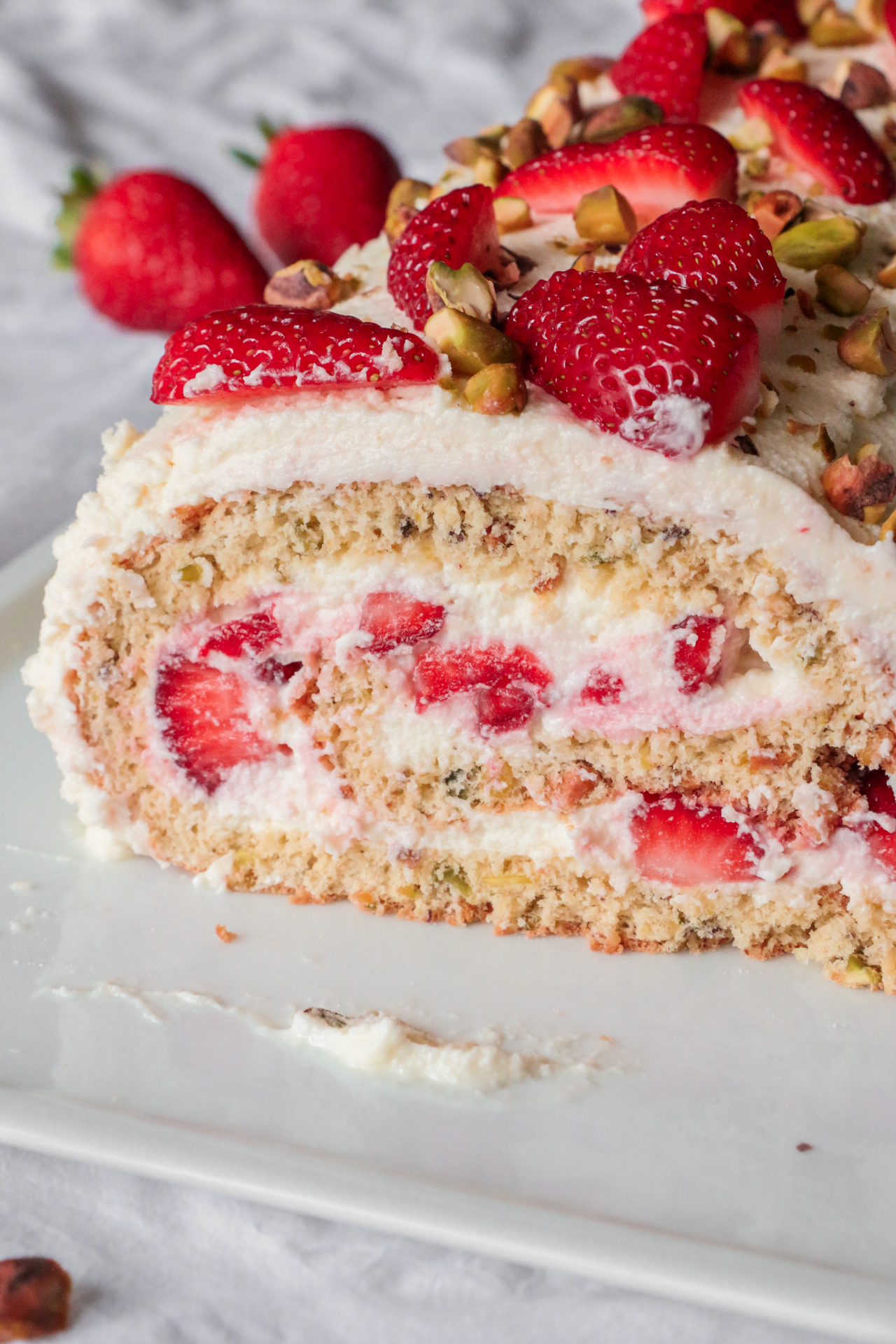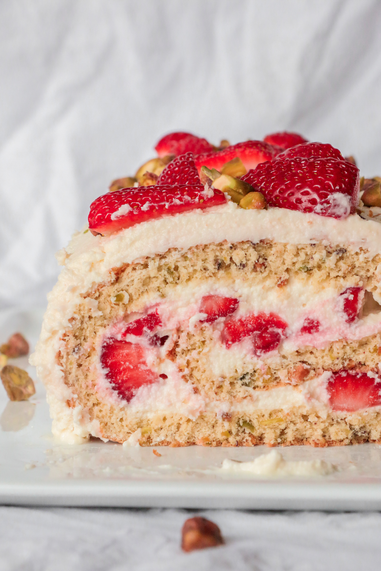 The first time I made this Yotom Ottolenghi recipe, all 6 of us took two bites, lay down our forks, and stared at each other in wide-eyed wonder! It’s that delicious. The original recipe calls for raspberries, but I think this celebration cake deserves to be the star that announces the first local strawberries. It does require a few steps but is relatively easy to make. So many delicious ingredients make up this dessert that it will be fantastic even if the cream oozes out or it doesn’t roll just right. Don’t let the stress of it not looking perfect stop you from making this delicious treat.