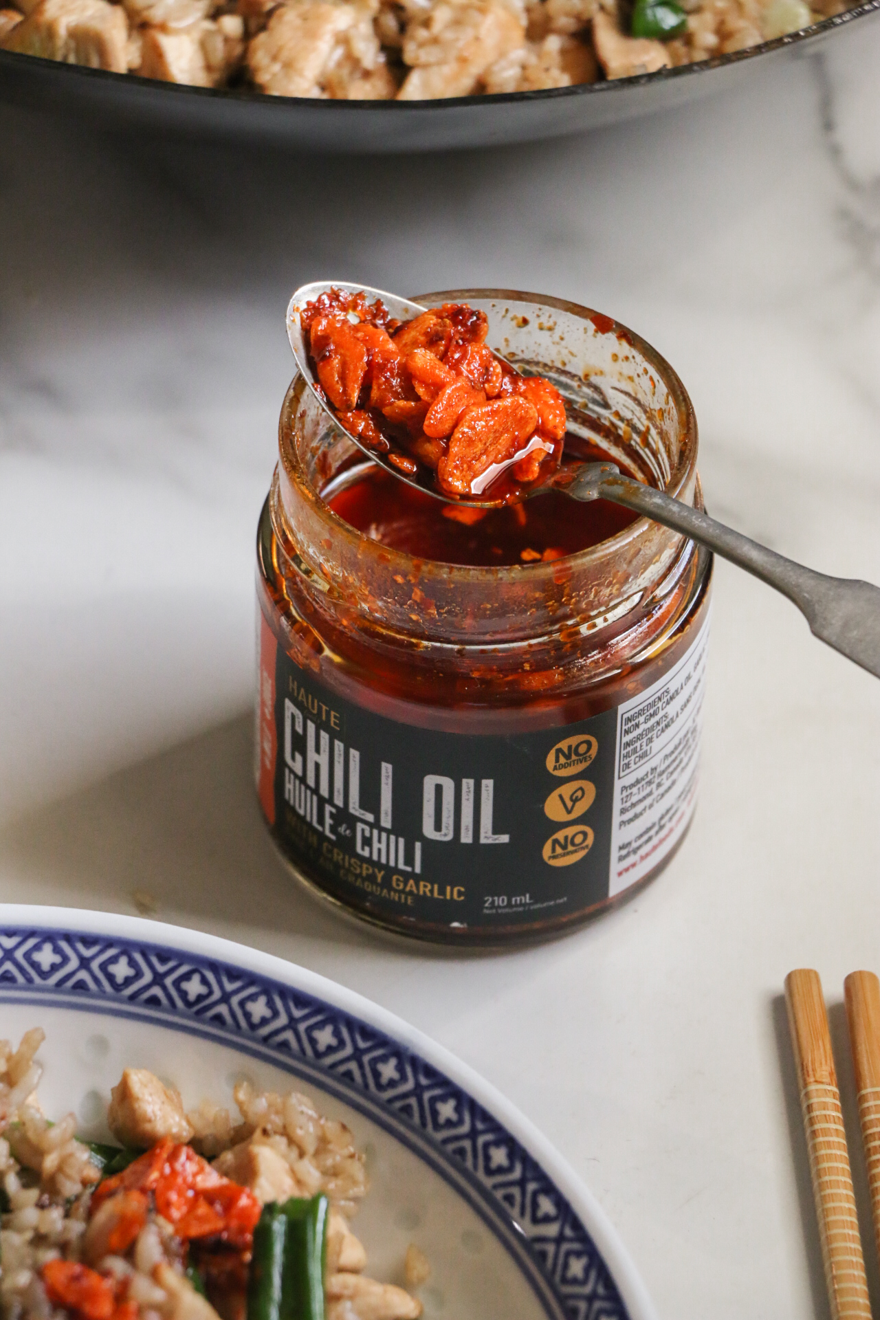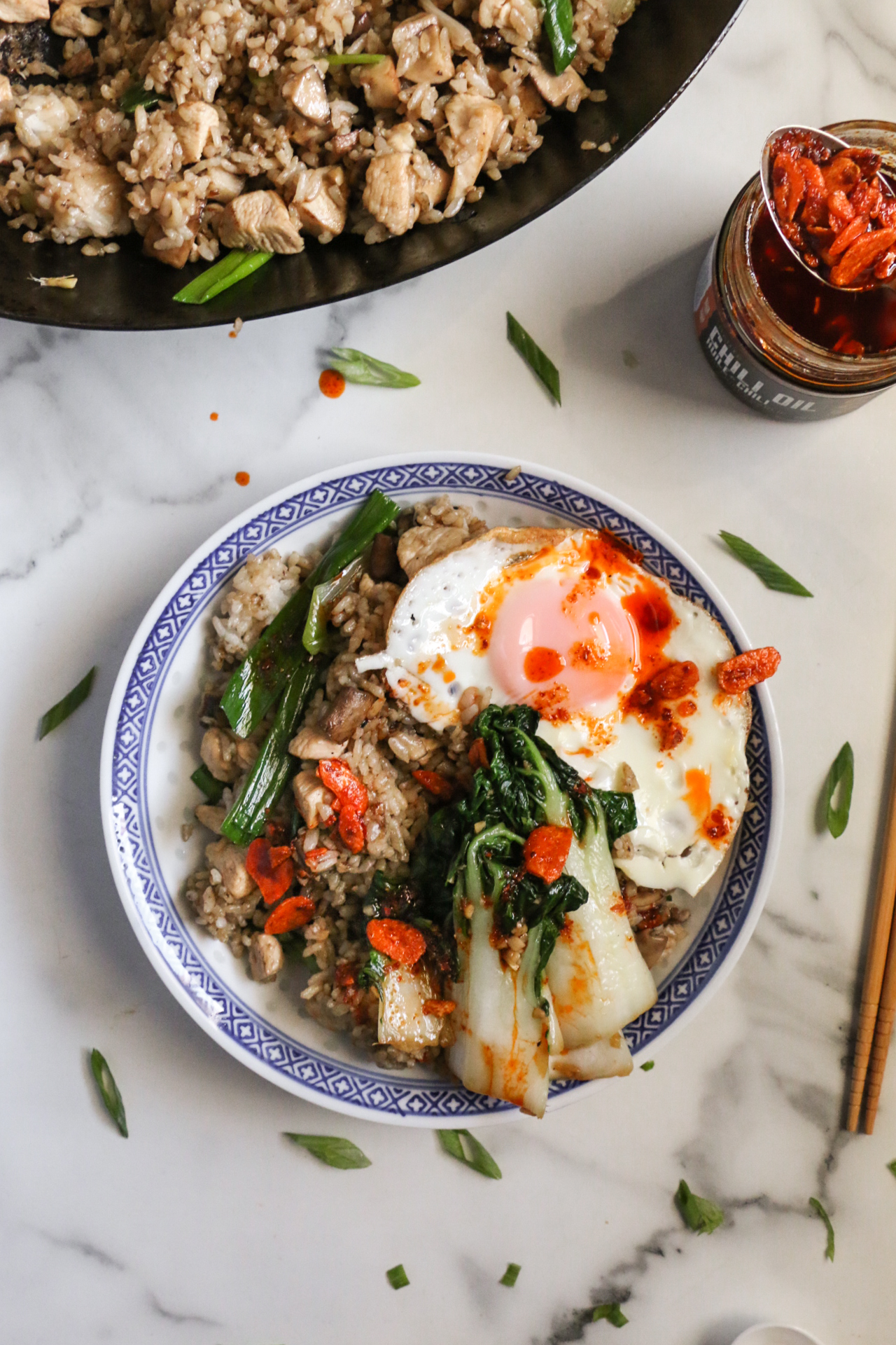 Plate with fried rice on the bottom, eggs, and bok choy on top. Garnish with Haute Garlic Chili Oil and sesame oil.