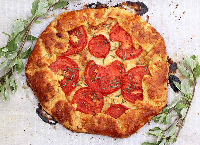 Spread the onion and corn mixture over the dough, leaving a 2-inch border without filling. Sprinkle the cheese over the onions and corn. Arrange the tomatoes in a single layer over the cheese and season them with salt and pepper. Lift the edges of the dough and fold them inward over the filling, pleating as you go, to form a folded-over border. Pinch together any tears in the dough. Brush the egg yolk and milk mixture over the exposed crust.
